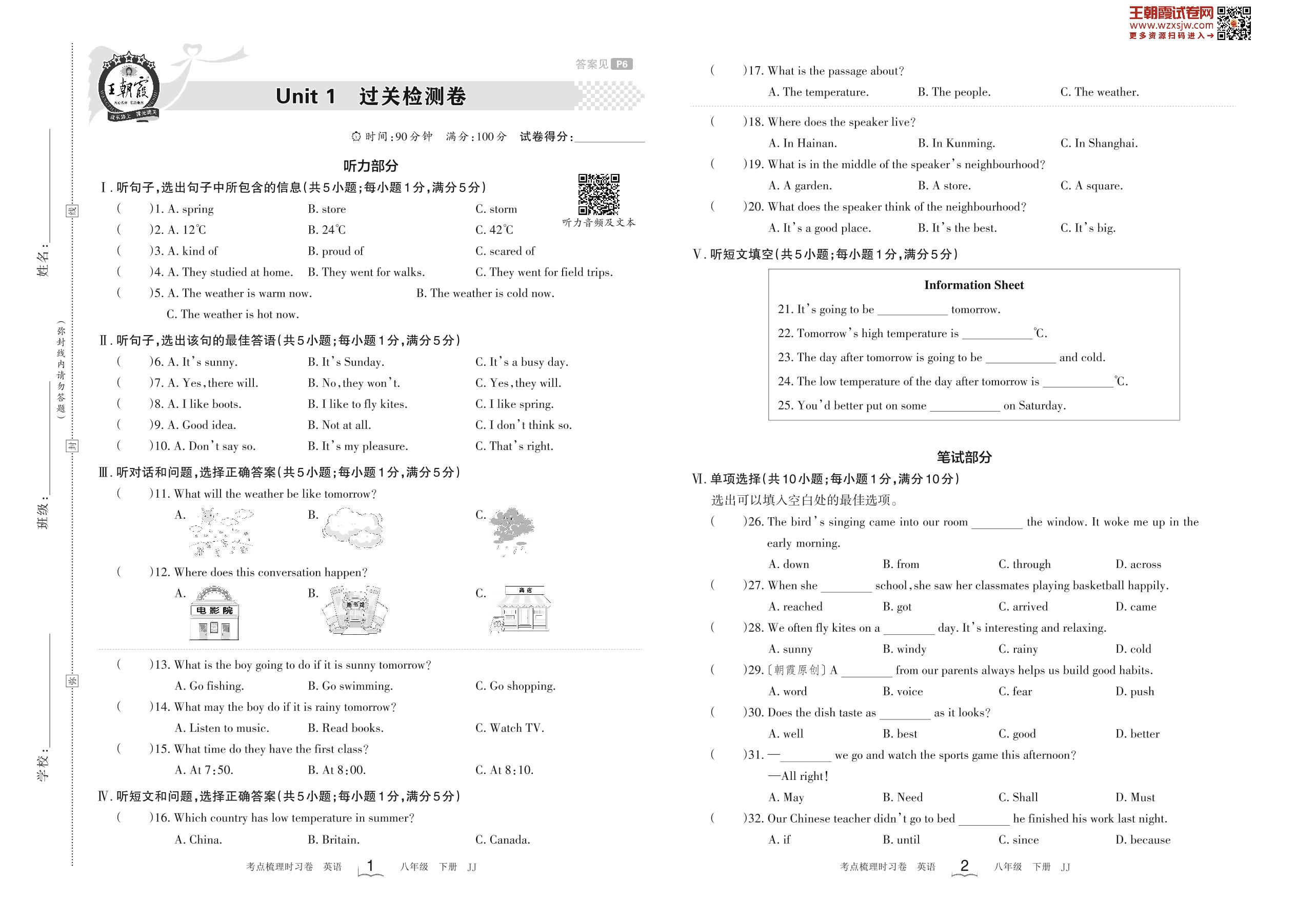 2023下册八年级英语冀教版 Unit 1 过关检测卷