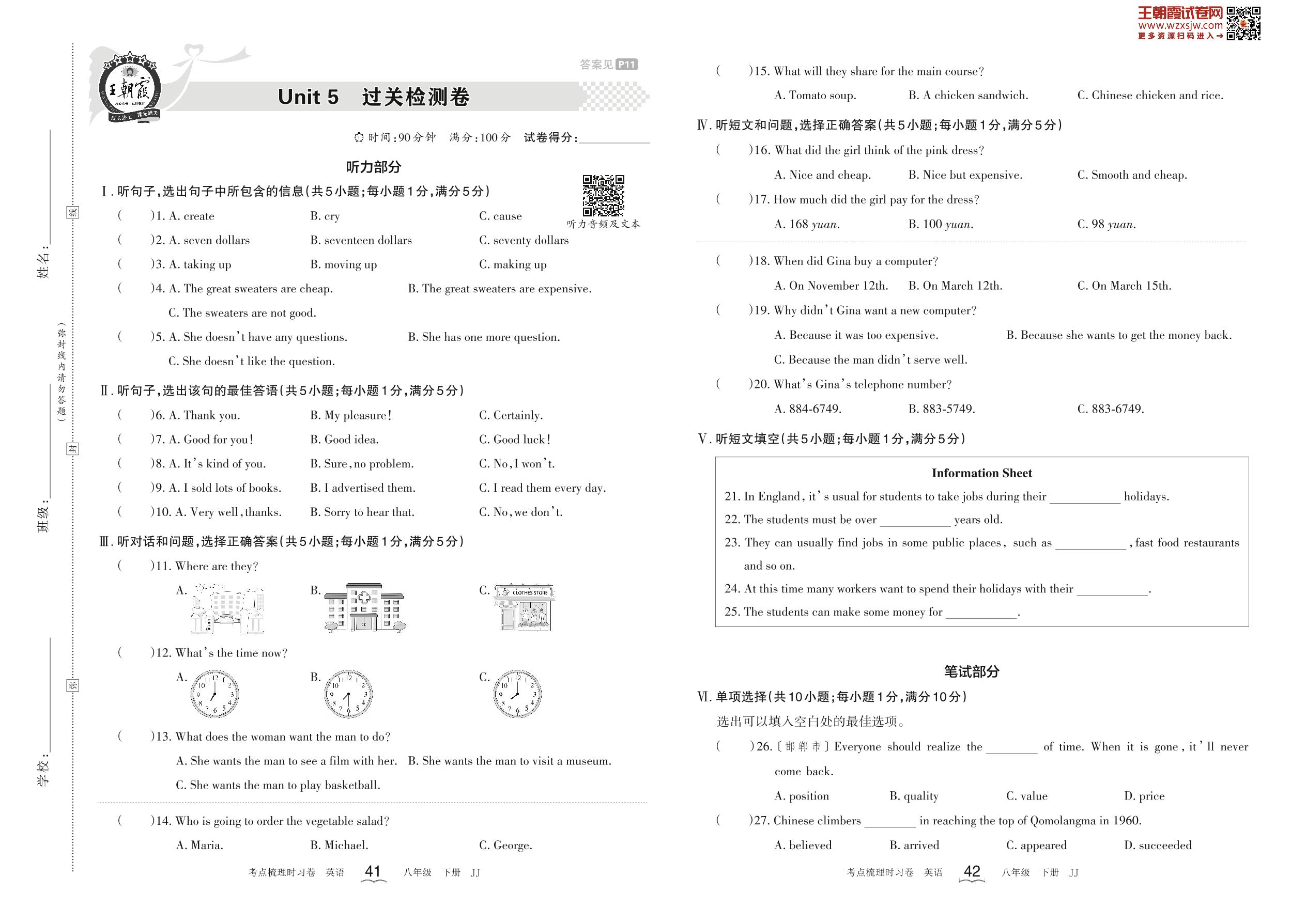 2023下册八年级英语冀教版 Unit 5 过关检测卷