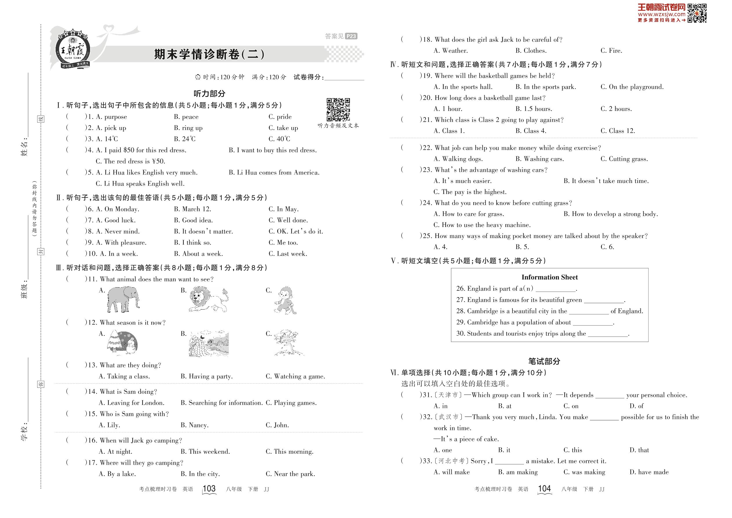 2023下册八年级英语冀教版 期末学情诊断卷(二)