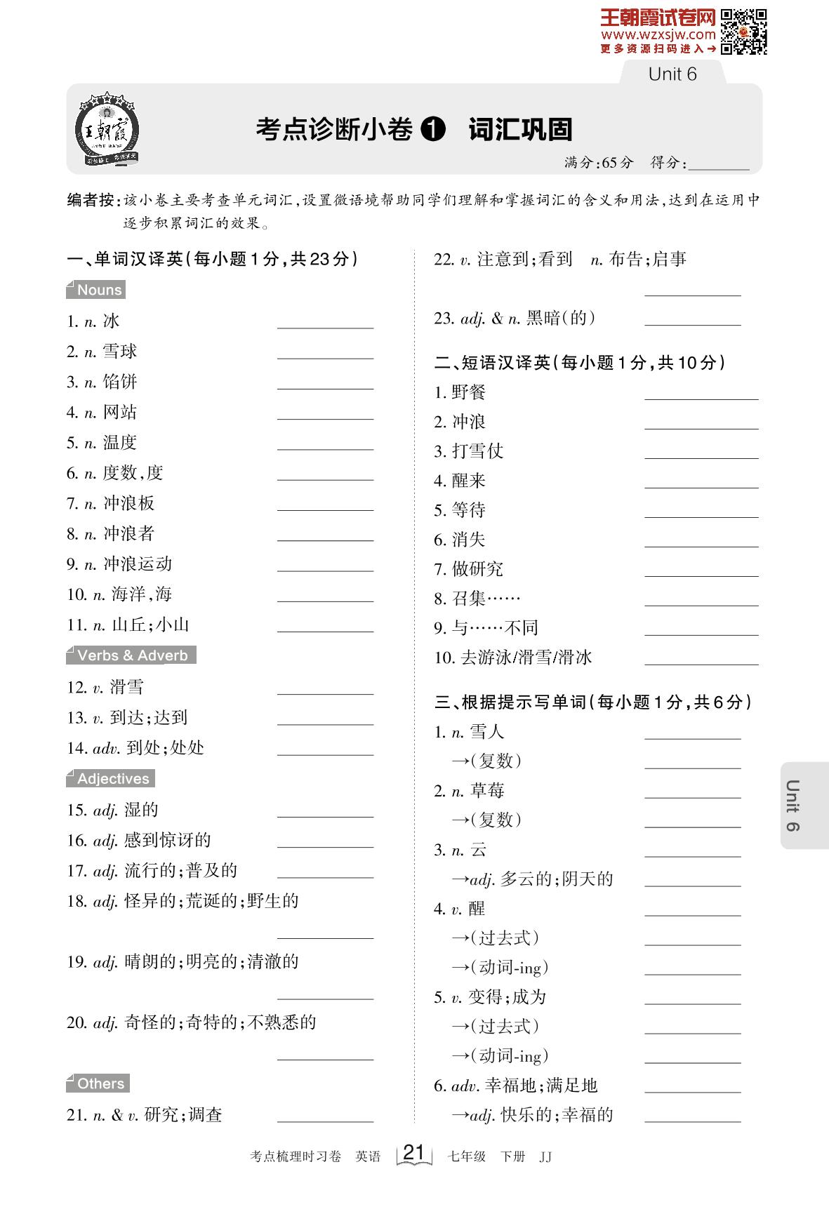 2023下册七年级英语冀教版 Unit 6 考点诊断小卷1 词汇巩固