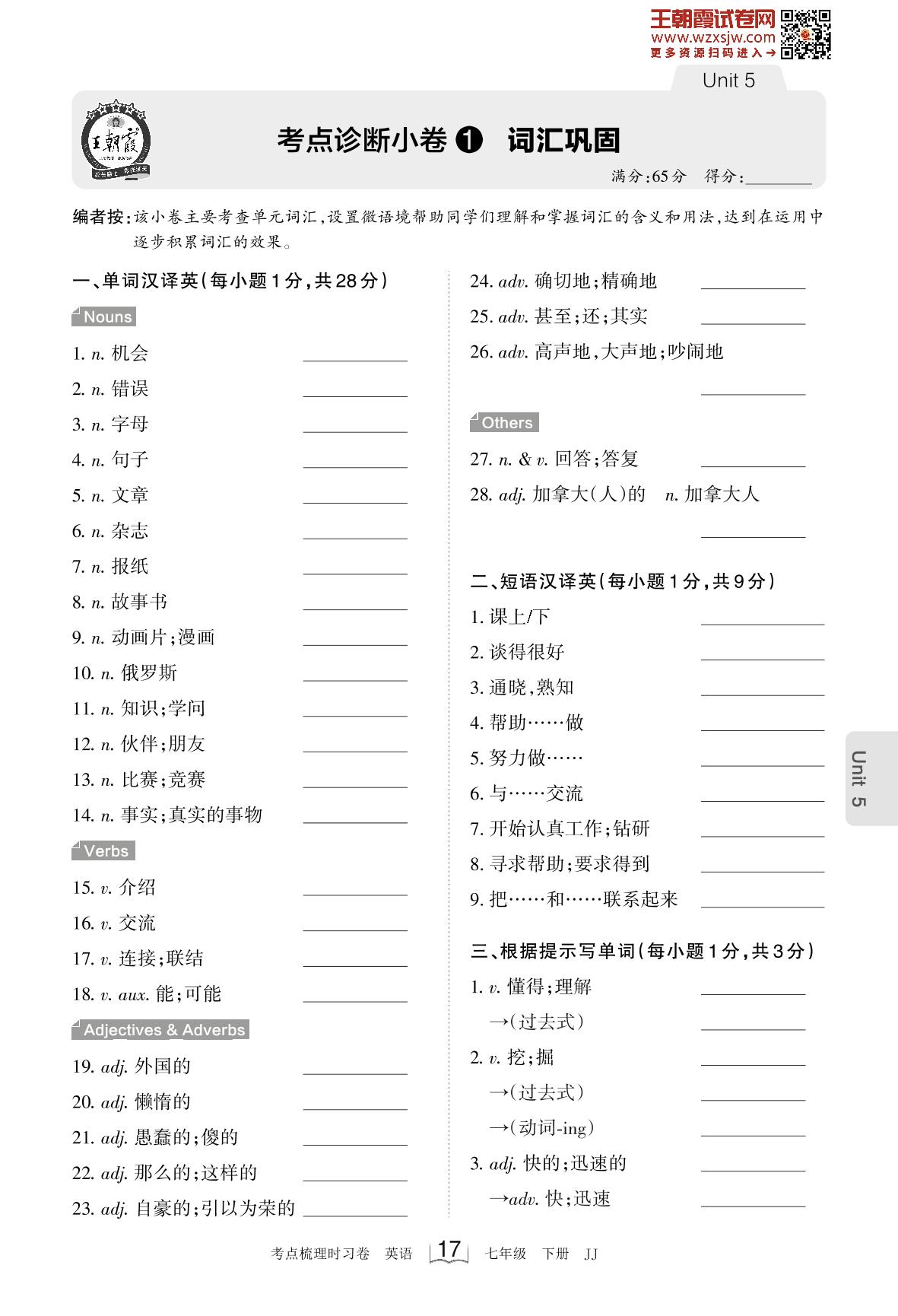 2023下册七年级英语冀教版 Unit 5 考点诊断小卷1 词汇巩固