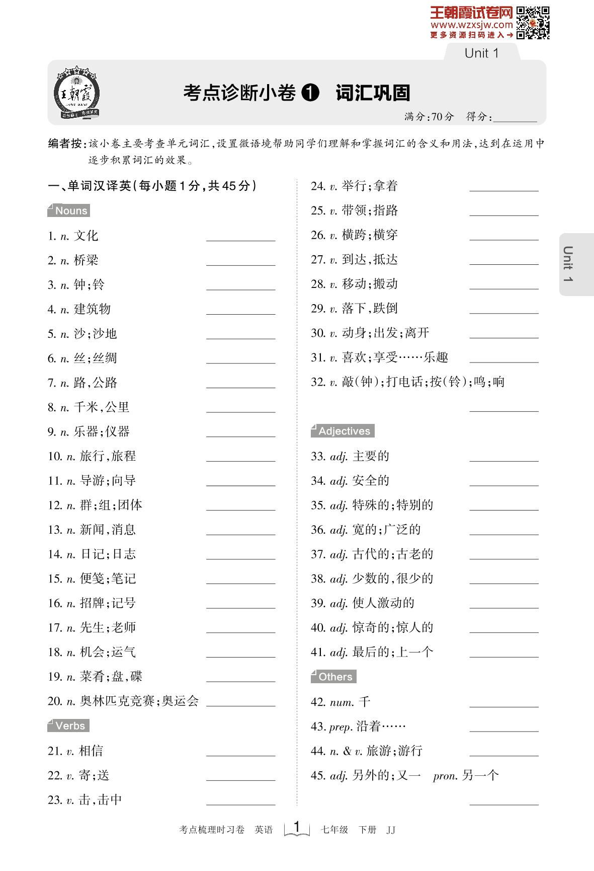 2023下册七年级英语冀教版 Unit 1 考点诊断小卷1 词汇巩固