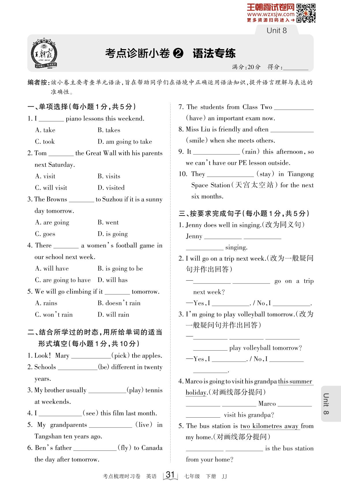 2023下册七年级英语冀教版 Unit 8 考点诊断小卷2 语法专练