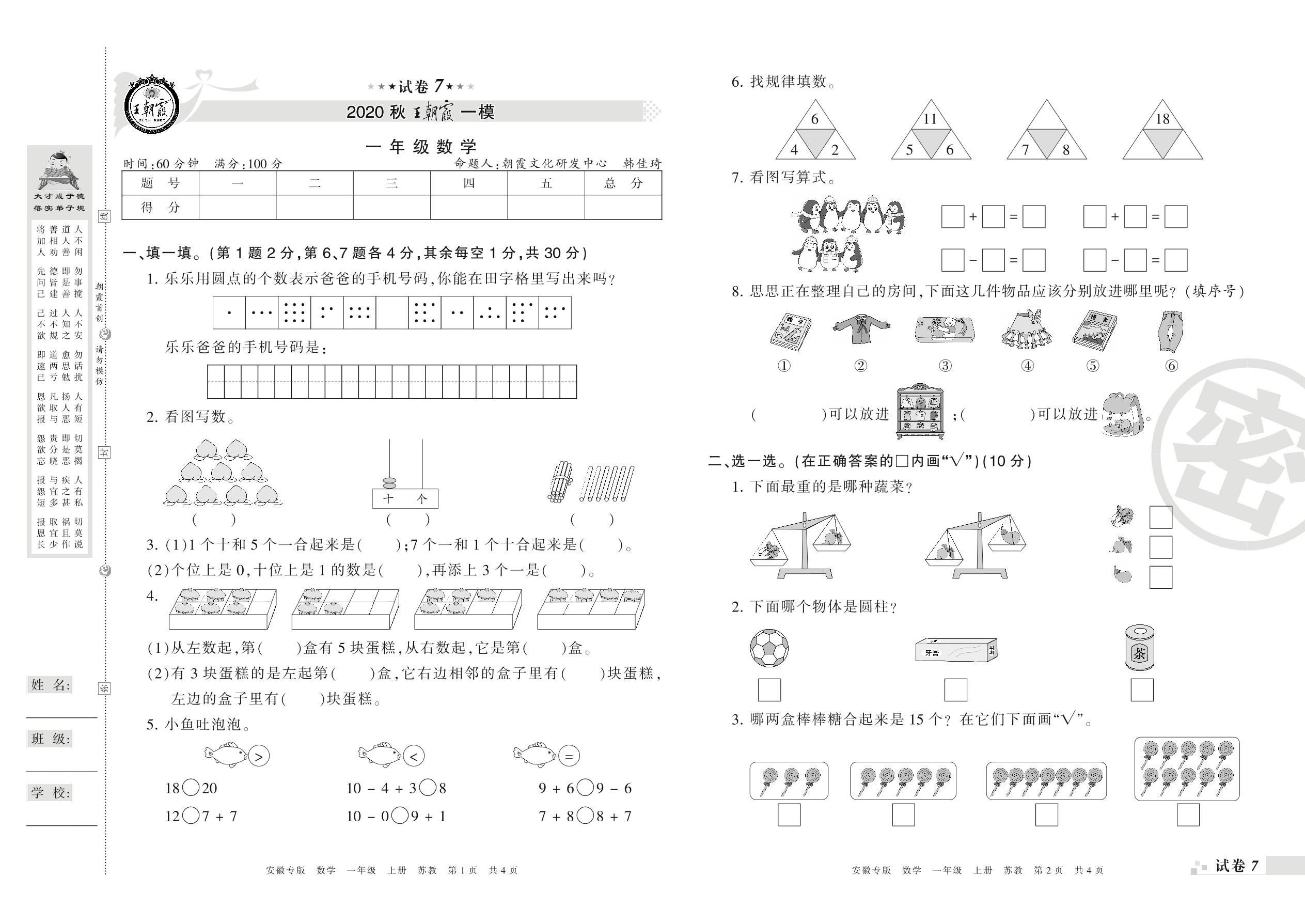 王朝霞期末模拟卷一年级上册数学(苏教版)_R210802212228【7】