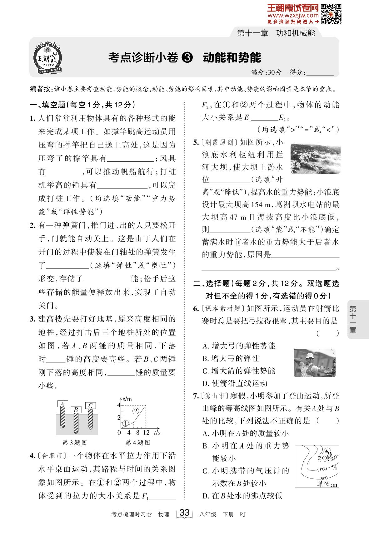2023下册八年级物理人教版 第十一章 考点诊断小卷3 动能和势能