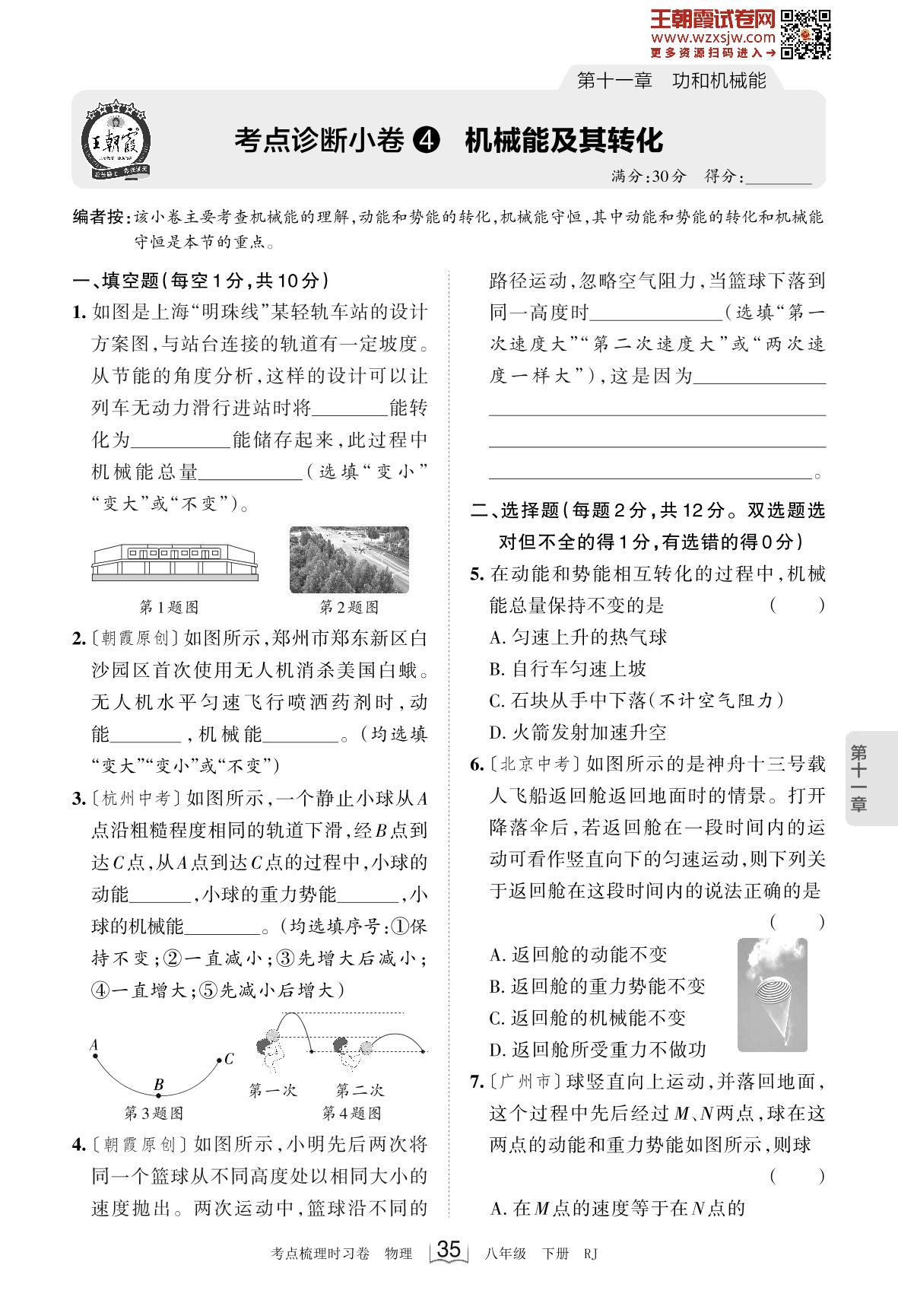 2023下册八年级物理人教版 第十一章 考点诊断小卷4 机械能及其转化