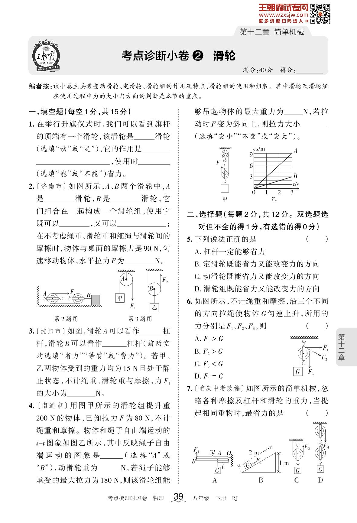 2023下册八年级物理人教版 第十二章 考点诊断小卷2 滑轮