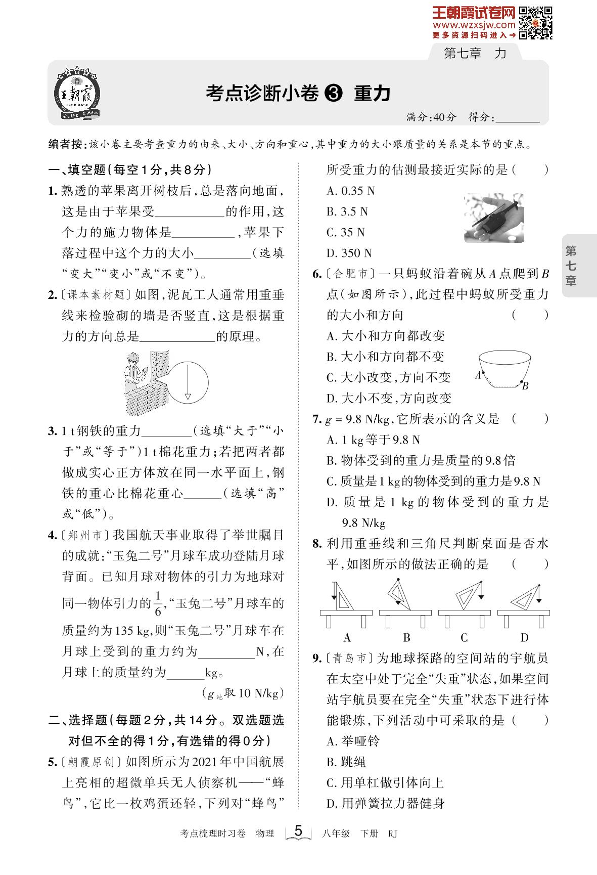2023下册八年级物理人教版 第七章 考点诊断小卷3 重力