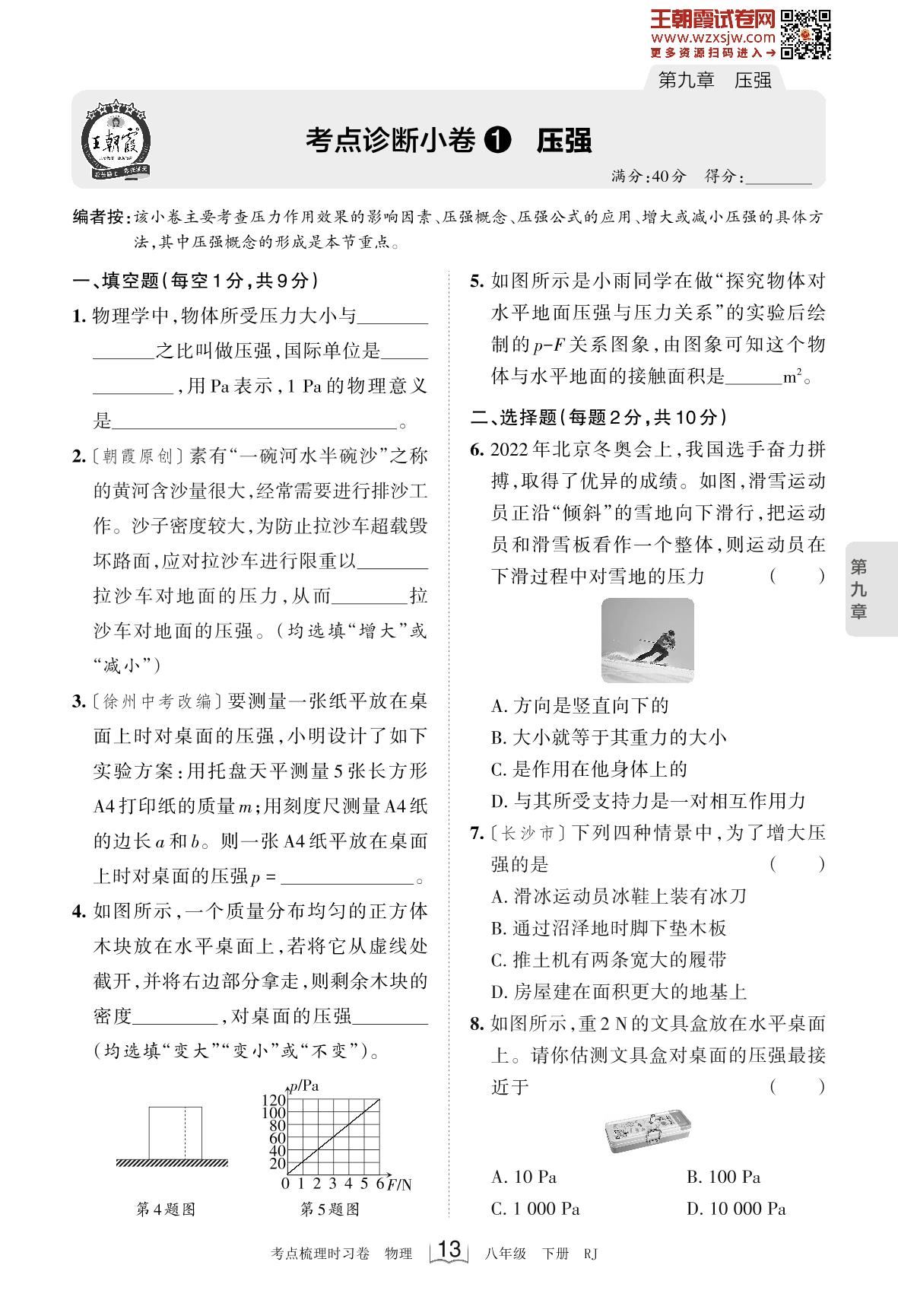 2023下册八年级物理人教版 第九章 考点诊断小卷1 压强