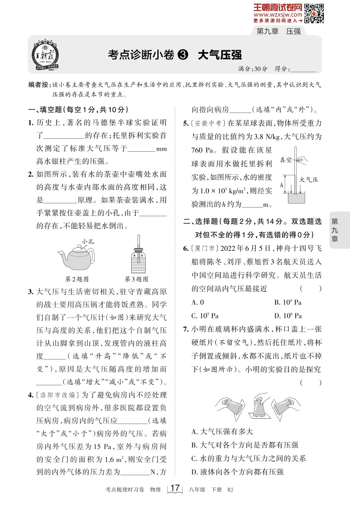 2023下册八年级物理人教版 第九章 考点诊断小卷3 大气压强