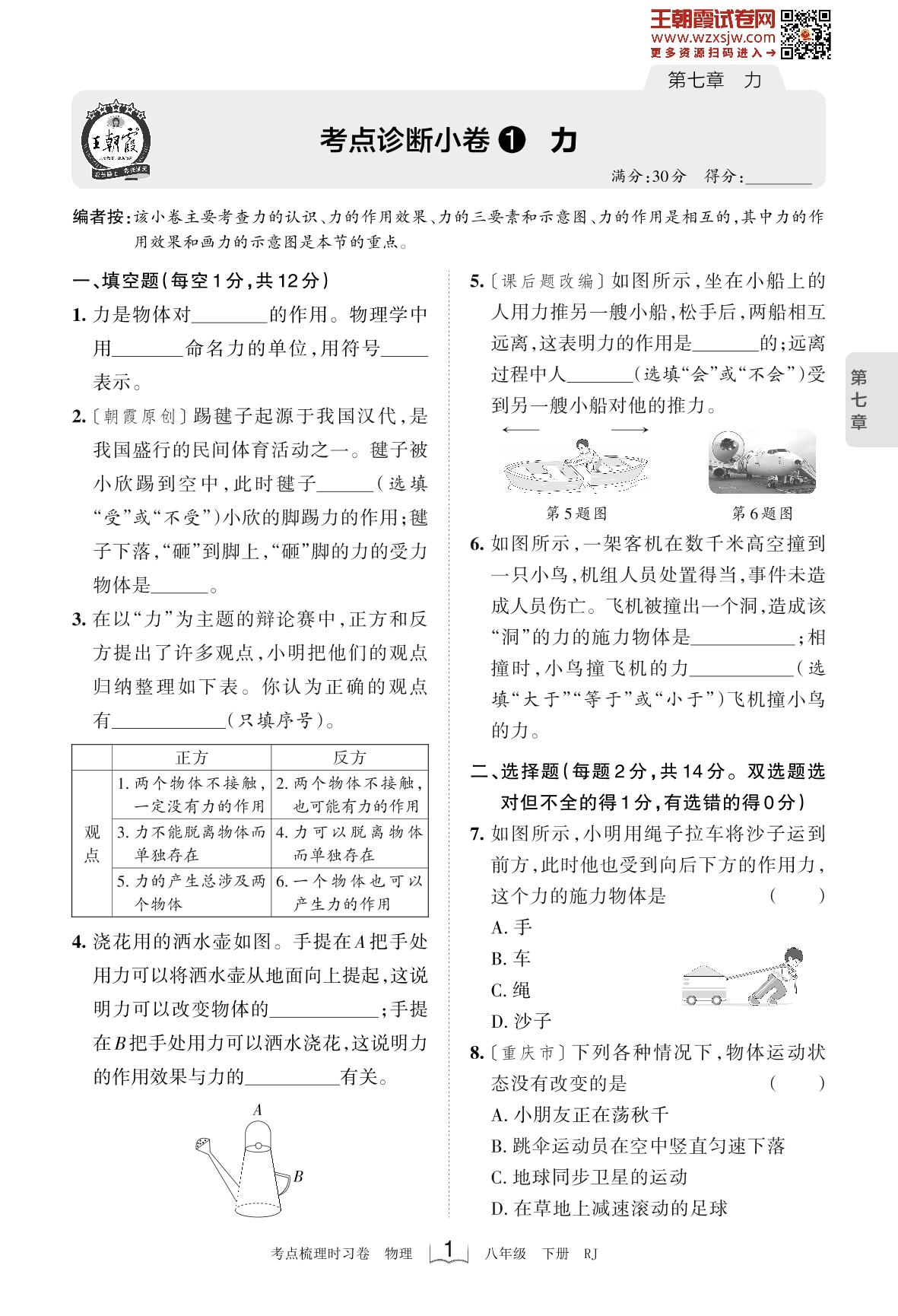 2023下册八年级物理人教版 第七章 考点诊断小卷1 力