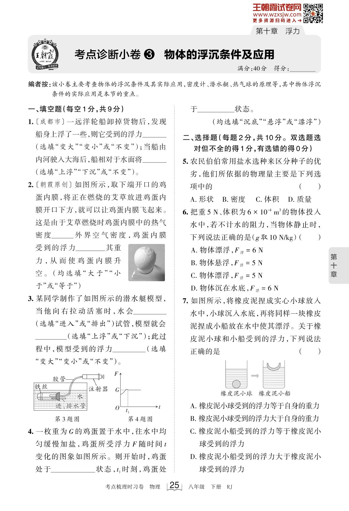2023下册八年级物理人教版 第十章 考点诊断小卷3 物体的浮沉条件及应用