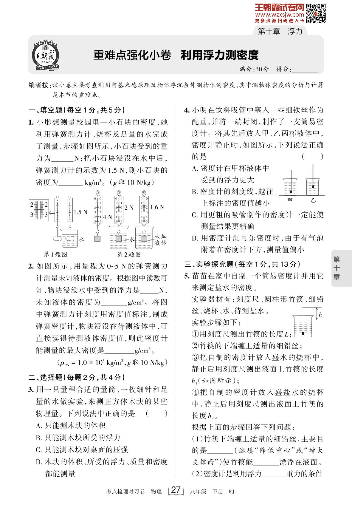 2023下册八年级物理人教版 第十章 重难点强化小卷 利用浮力测密度