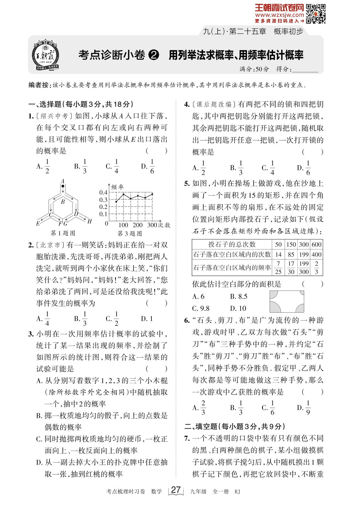 2023上册九年级数学人教版 第二十五章 考点诊断小卷2 用列举法求概率、用频率估计概率