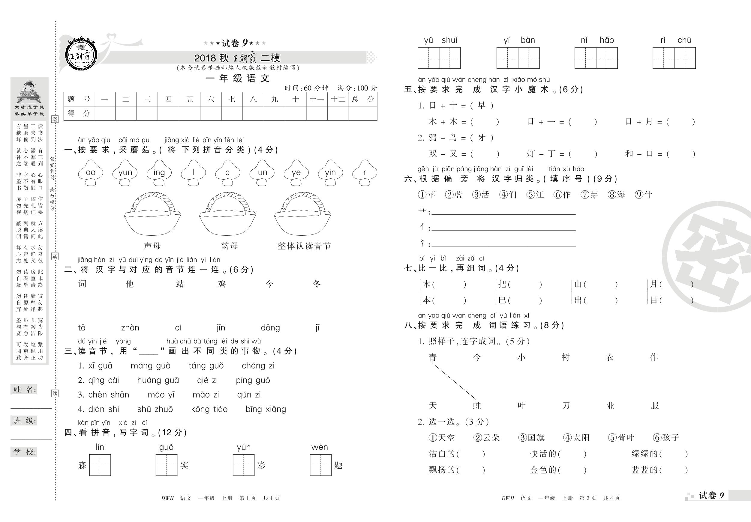 王朝霞期末模拟卷一年级上册语文(人教版)_R210731190345【9】