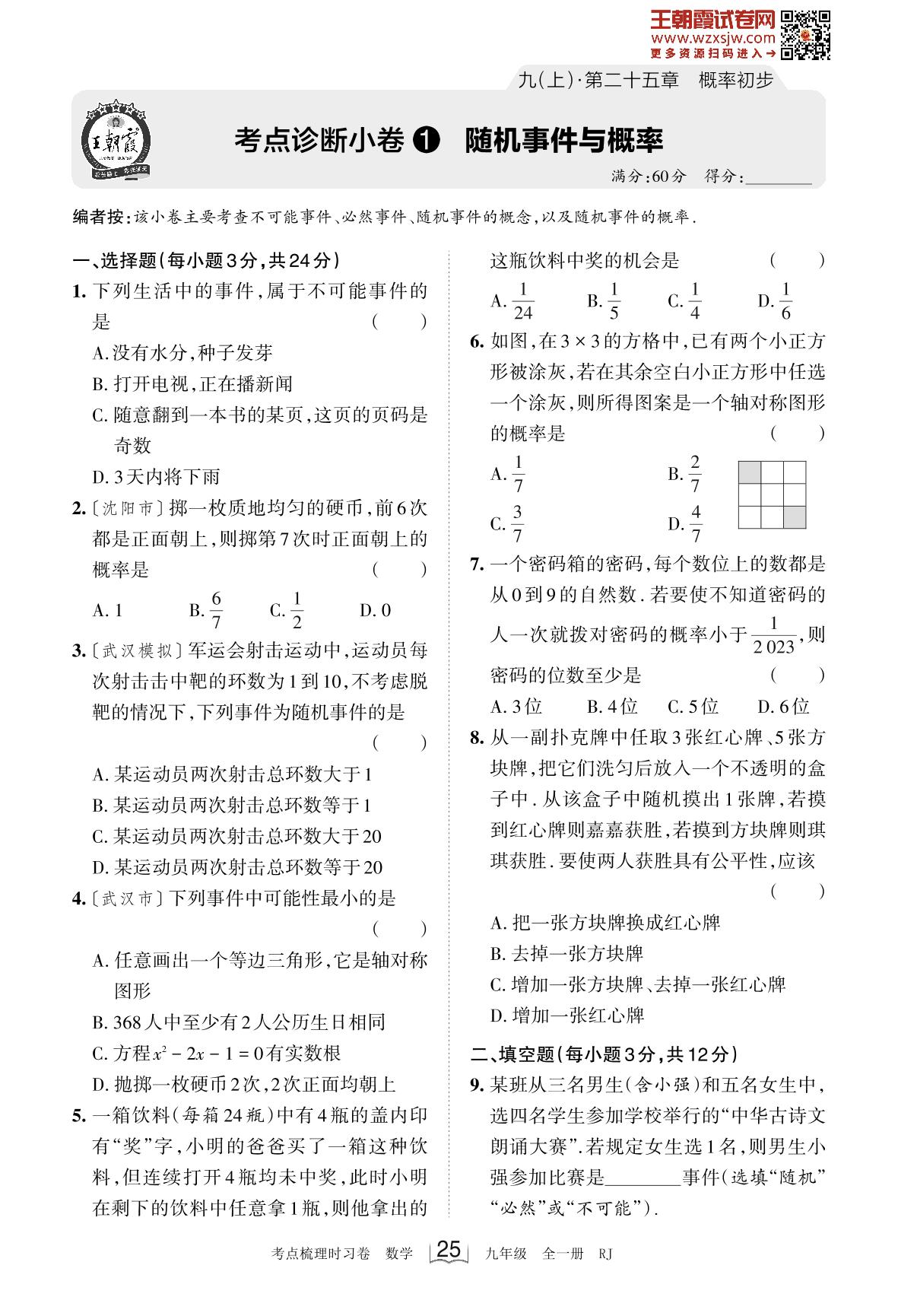 2023上册九年级数学人教版 第二十五章 考点诊断小卷1 随机事件与概率