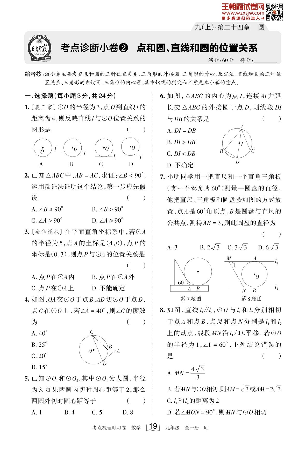 2023上册九年级数学人教版 第二十四章 考点诊断小卷2 点和圆、直线和圆的位置关系