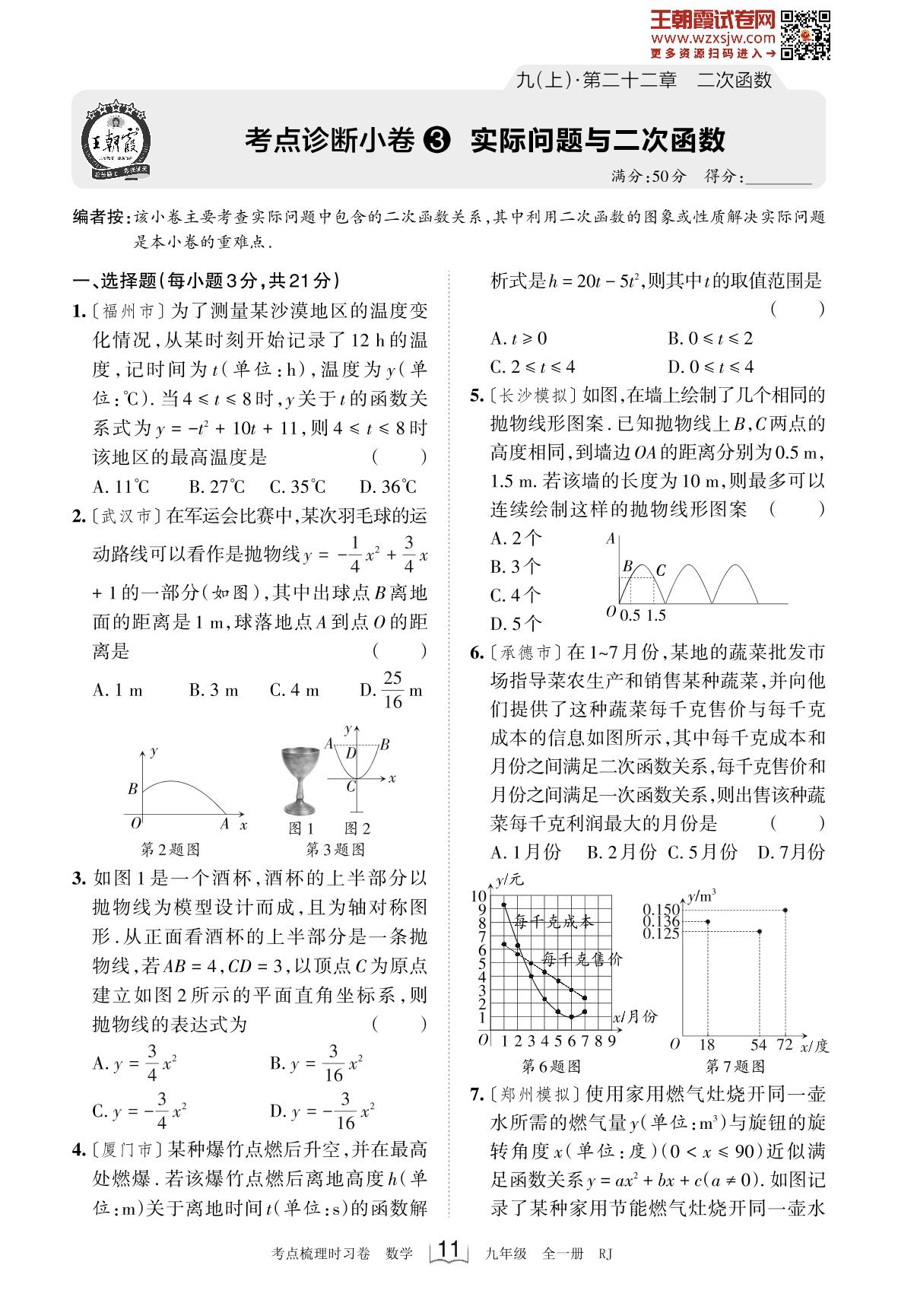 2023上册九年级数学人教版 第二十二章 考点诊断小卷3 实际问题与二次函数