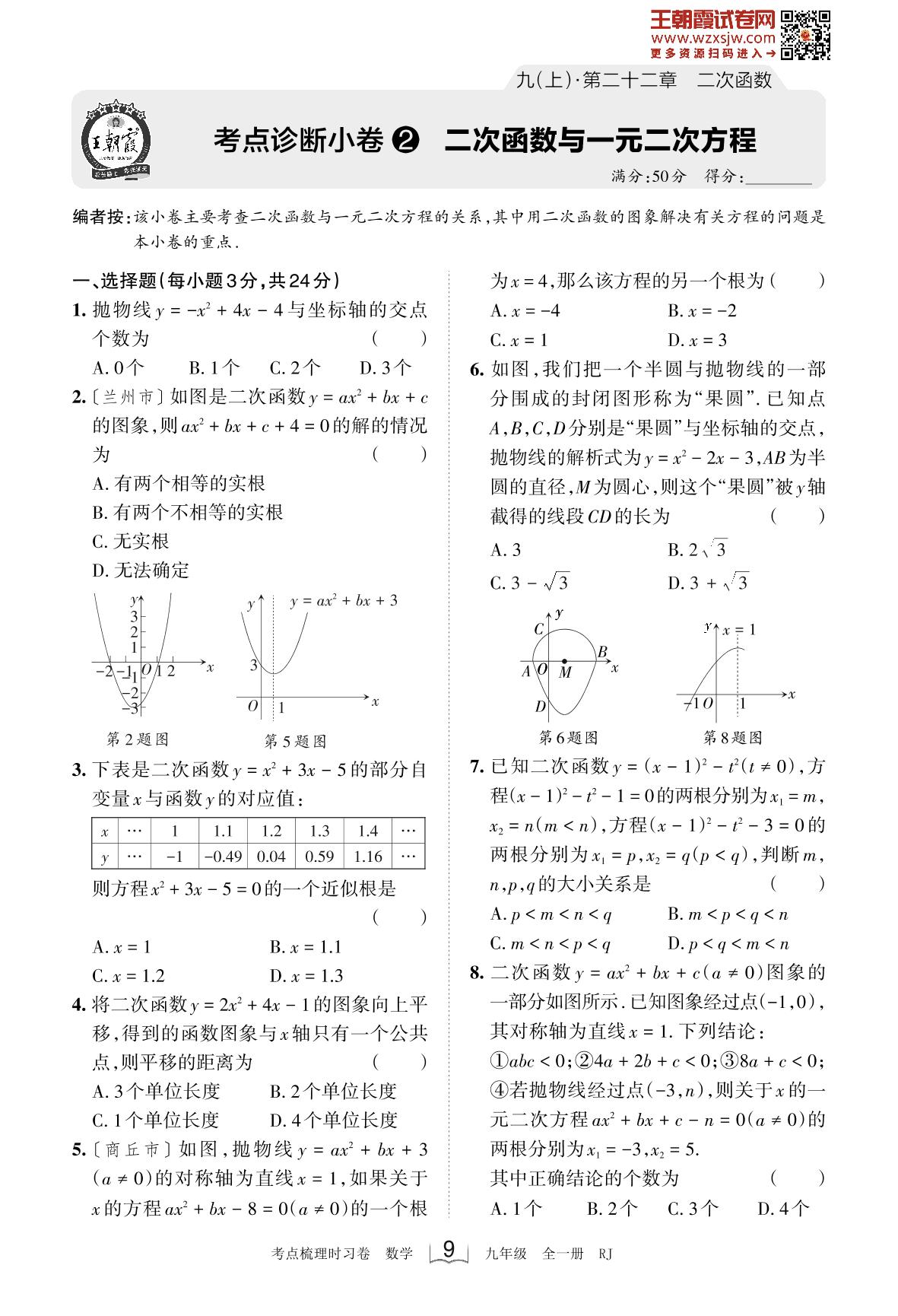 2023上册九年级数学人教版 第二十二章 考点诊断小卷2 二次函数与一元二次方程