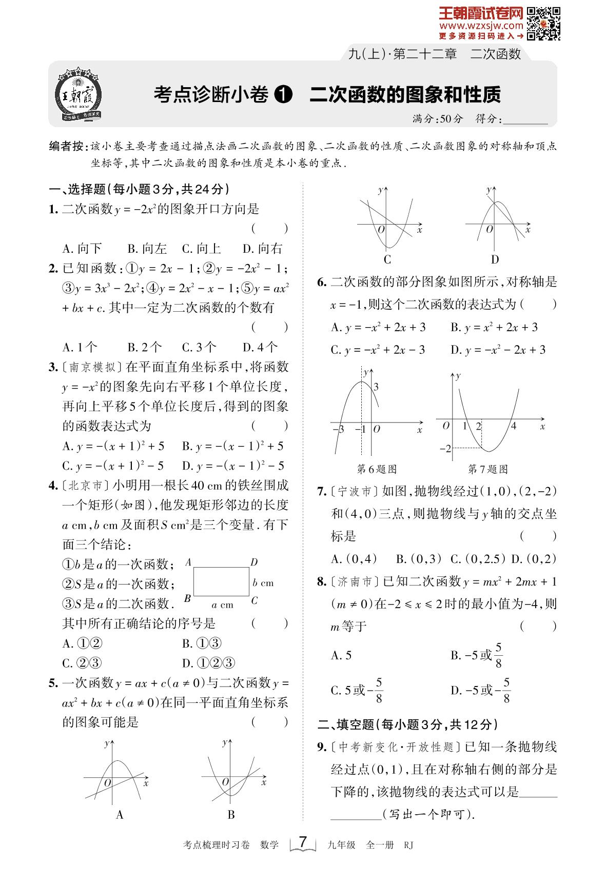 2023上册九年级数学人教版 第二十二章 考点诊断小卷1 二次函数的图象和性质