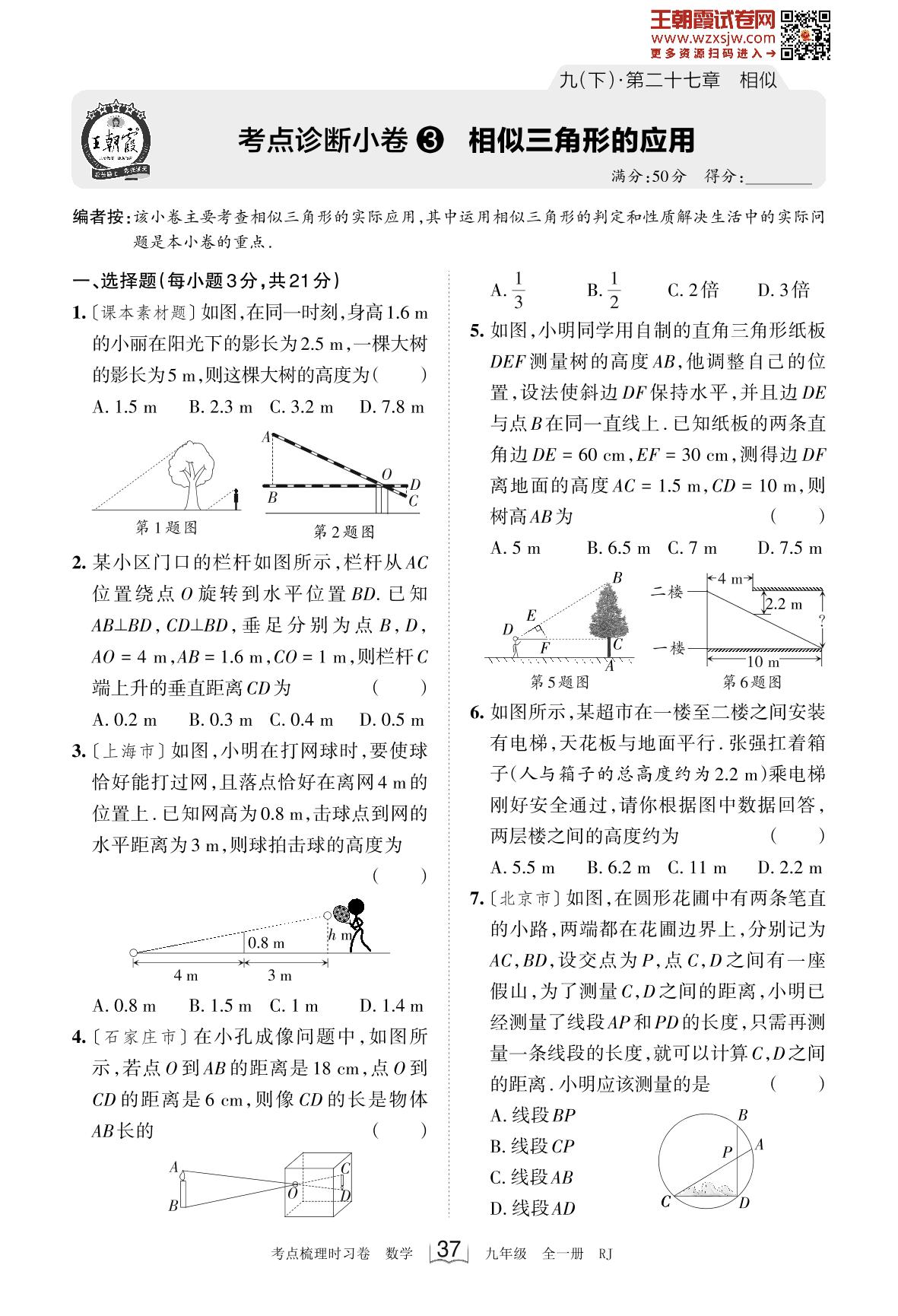 2024下册九年级数学人教版 第二十七章 考点诊断小卷3 相似三角形的应用