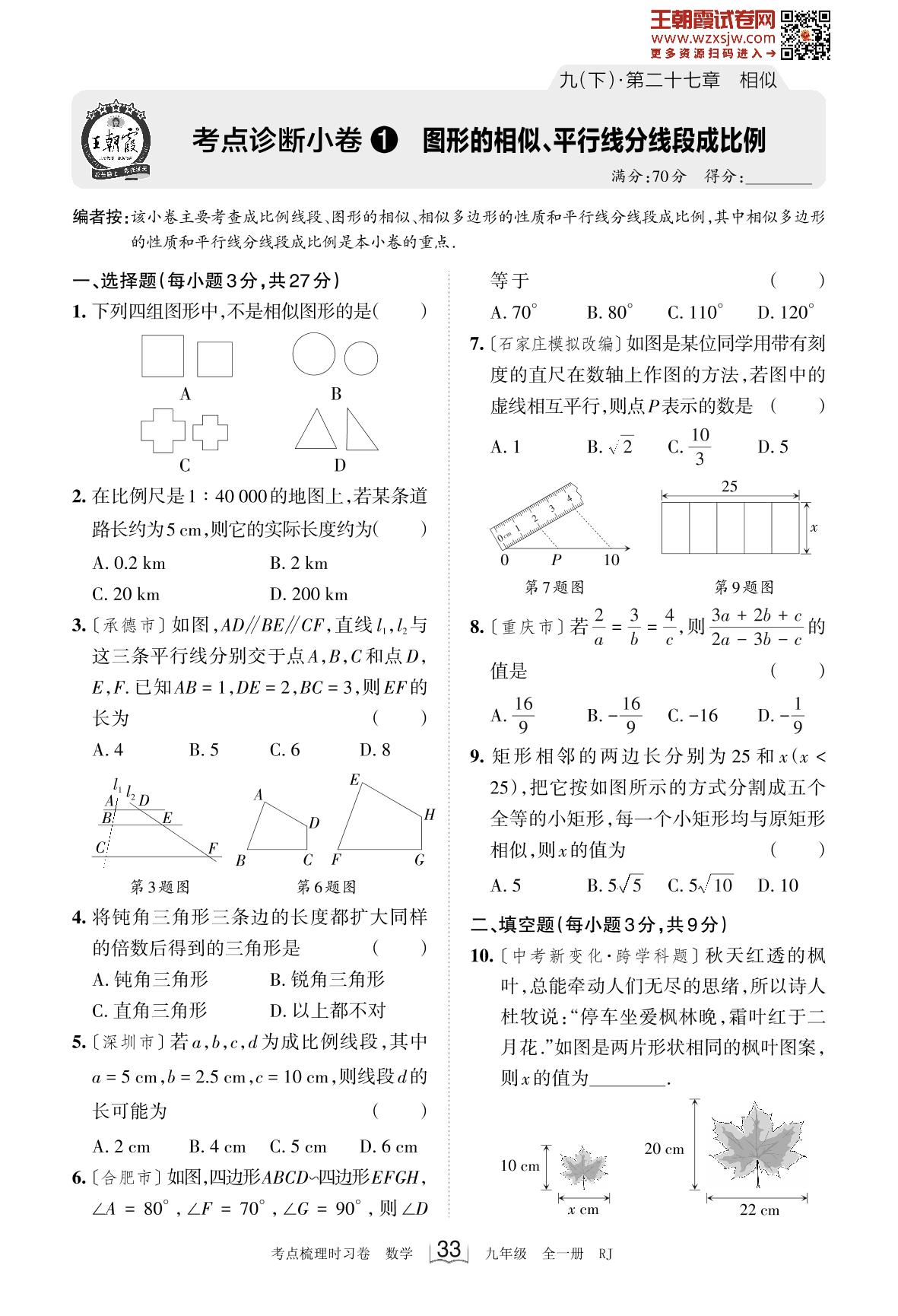 2024下册九年级数学人教版 第二十七章 考点诊断小卷1 图形的相似、平行线分线段成比例