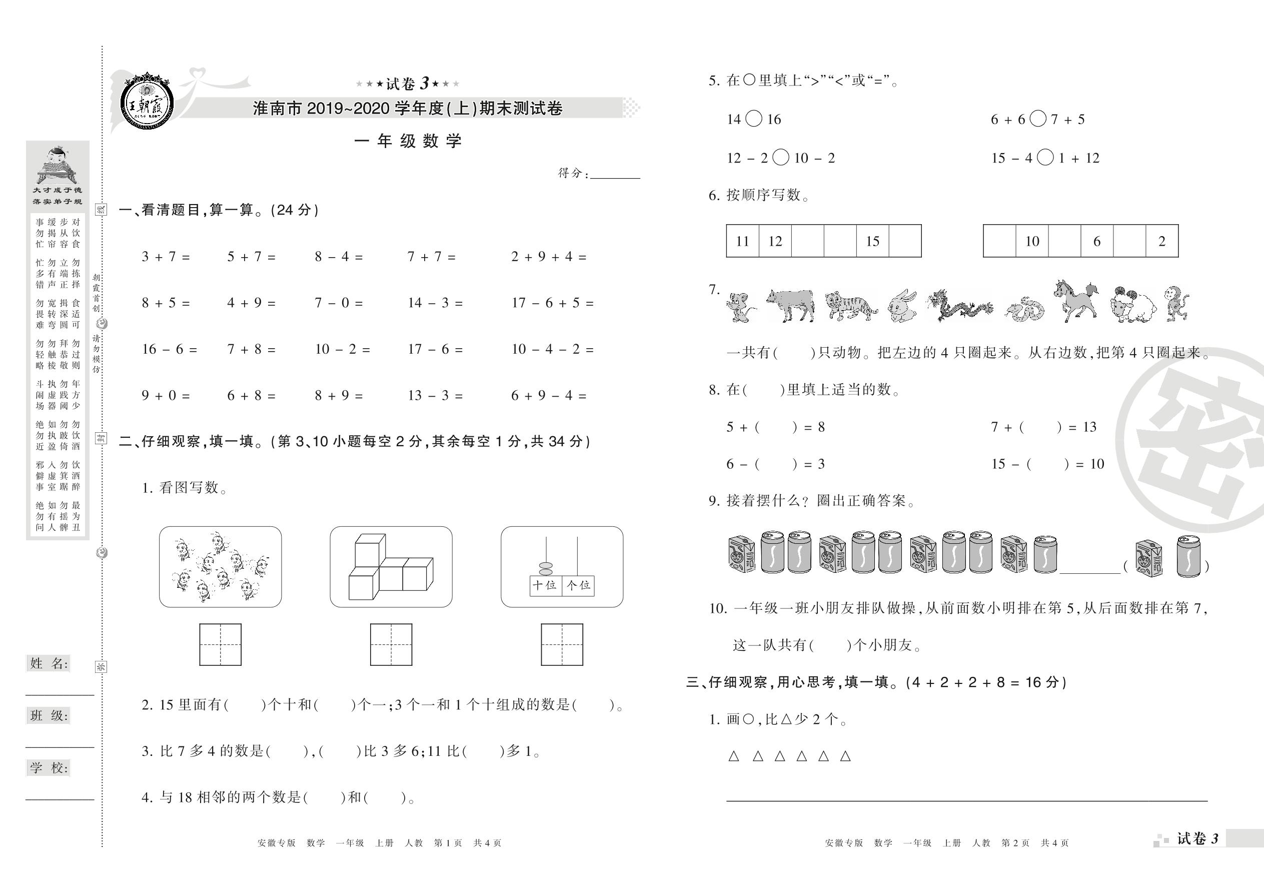 2019-2020学年第一学期淮南市一年级数学试卷(人教版)【3】