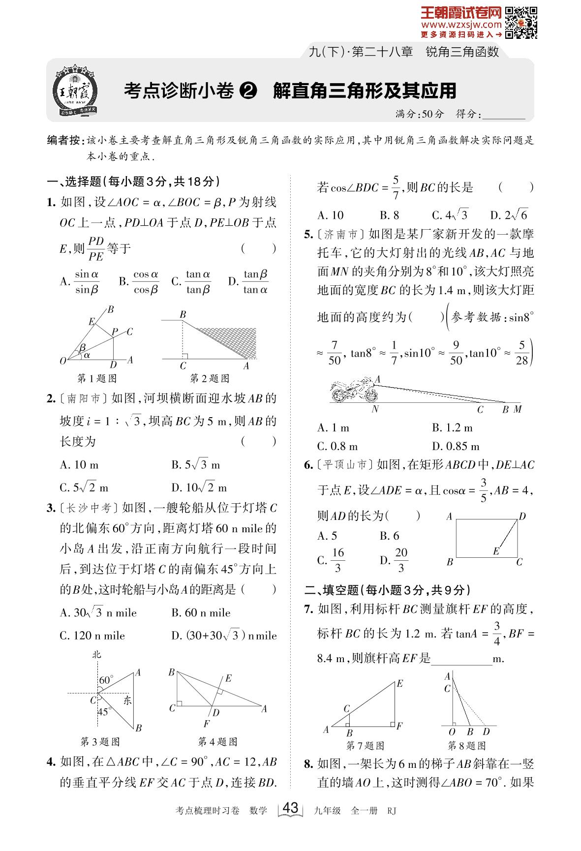 2024下册九年级数学人教版 第二十八章 考点诊断小卷2 解直角三角形及其应用