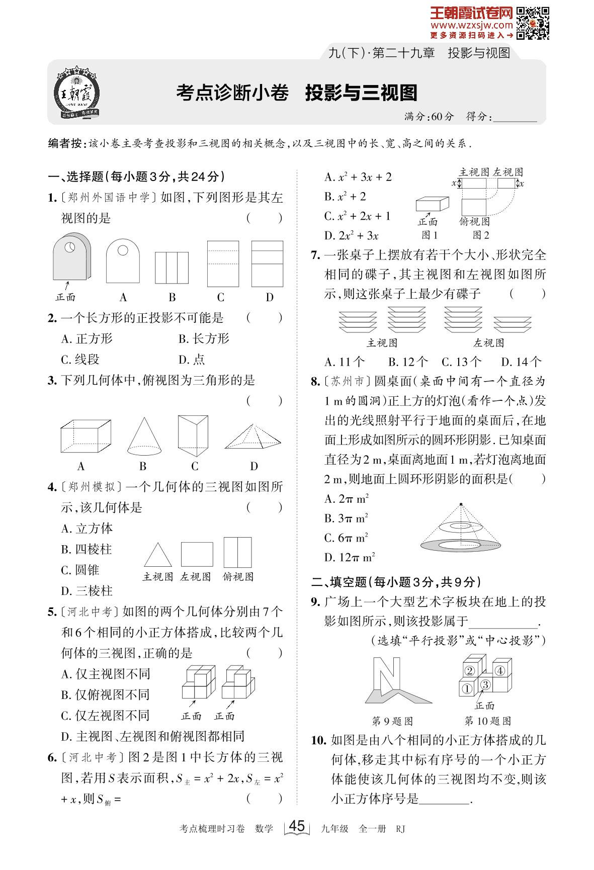 2024下册九年级数学人教版 第二十九章 考点诊断小卷 投影与三视图