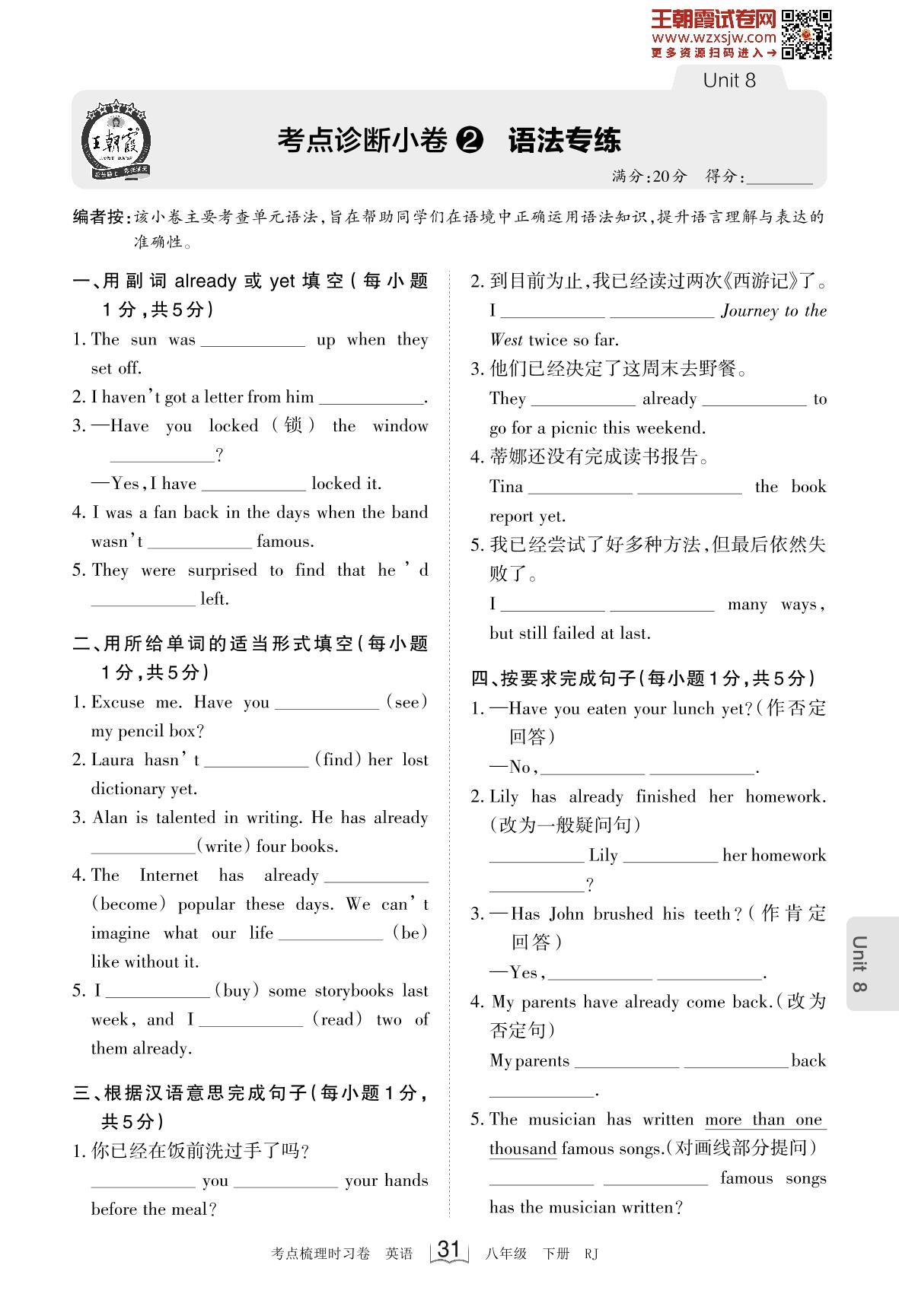 2023下册八年级英语人教版 Unit 8 考点诊断小卷2 语法专练_R230220090447946