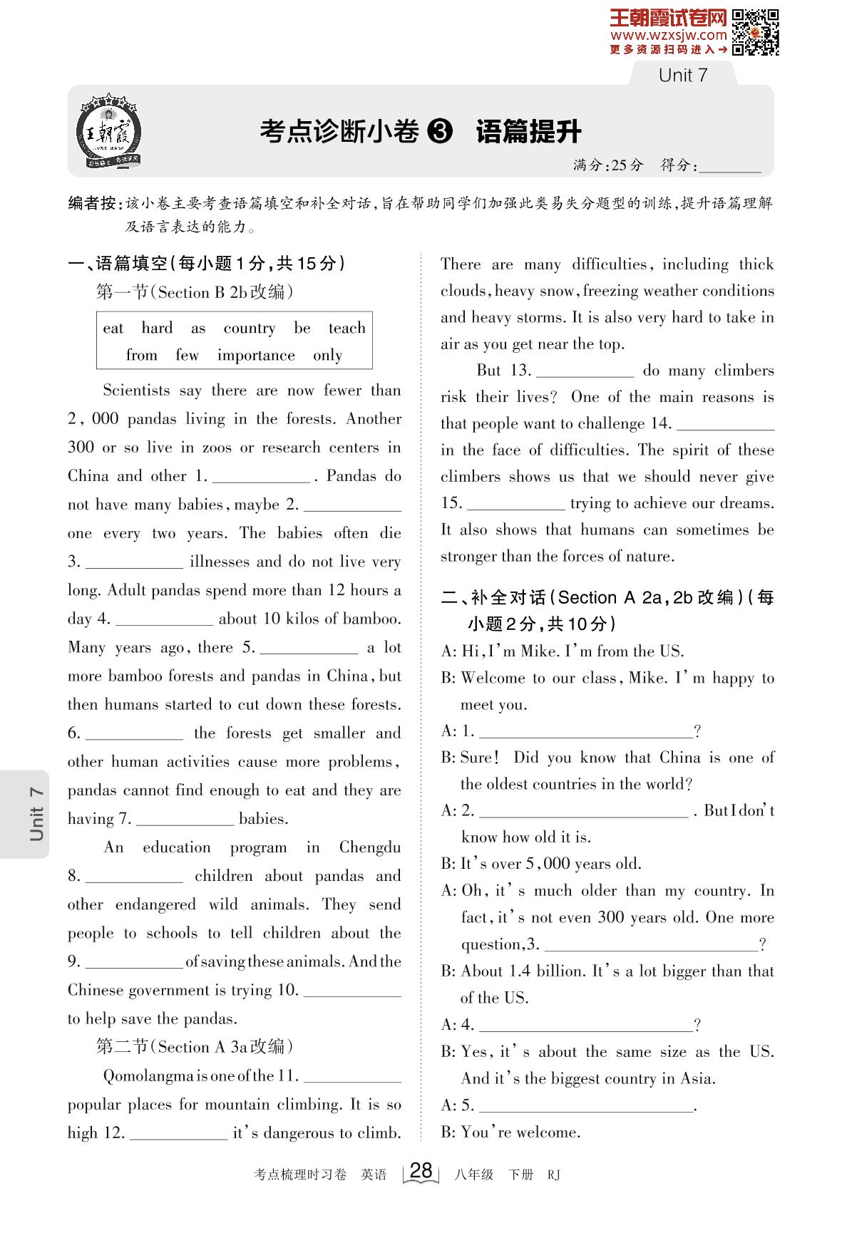2023下册八年级英语人教版 Unit 7 考点诊断小卷3 语篇提升_R230220090447122