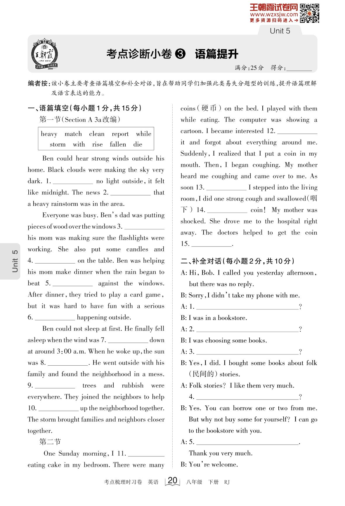 2023下册八年级英语人教版 Unit 5 考点诊断小卷3 语篇提升_R230220090447969