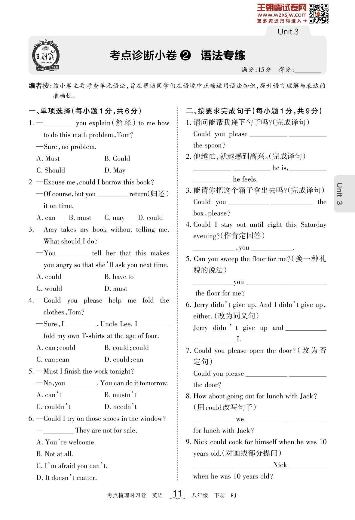 2023下册八年级英语人教版 Unit 3 考点诊断小卷2 语法专练_R230220090448766
