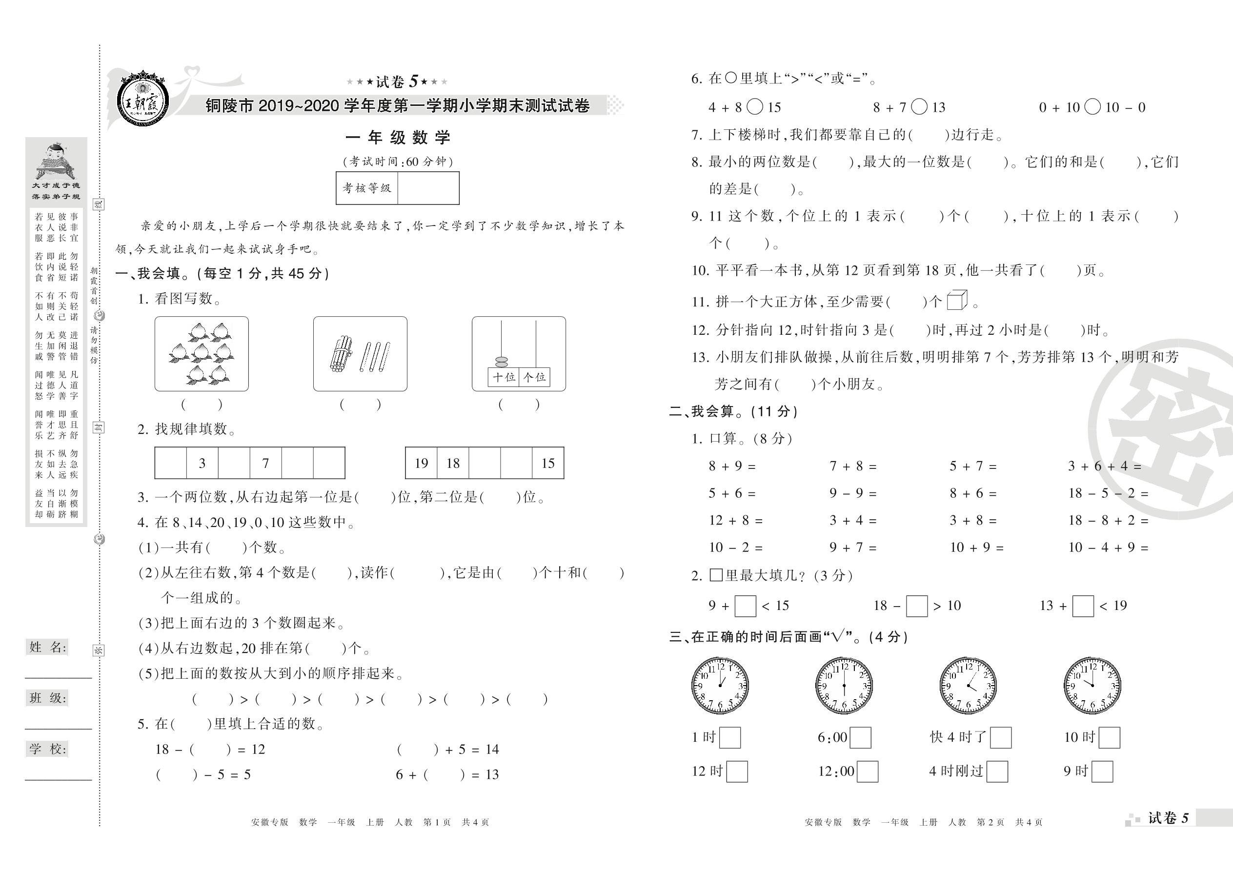 2019-2020学年第一学期铜陵市一年级数学试卷(人教版)【5】