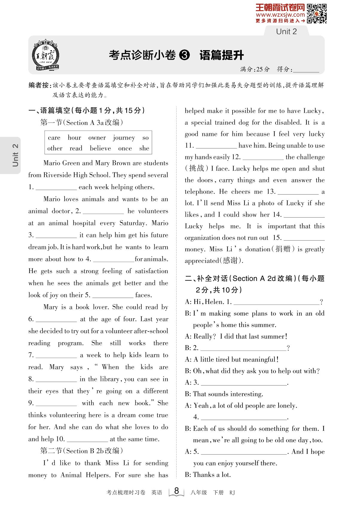 2023下册八年级英语人教版 Unit 2 考点诊断小卷3 语篇提升_R230220090449954