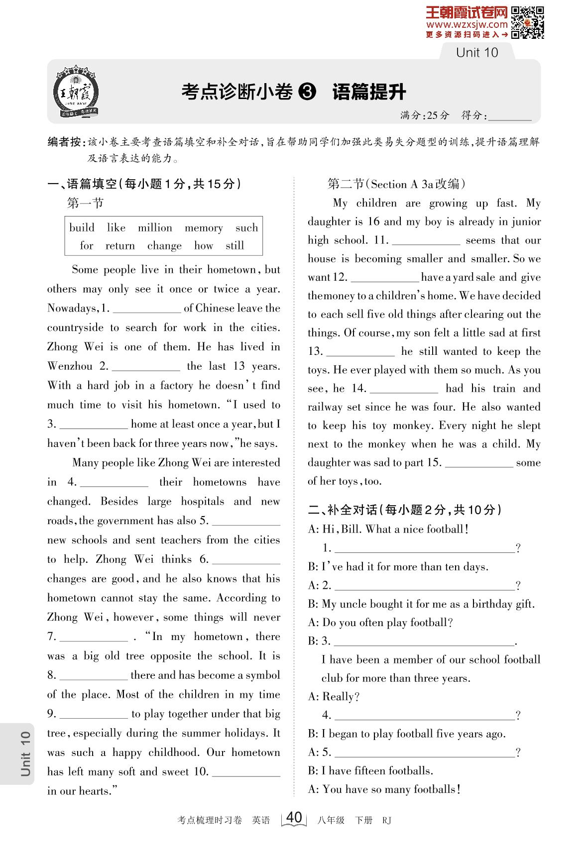 2023下册八年级英语人教版 Unit 10 考点诊断小卷3 语篇提升_R230220090449003