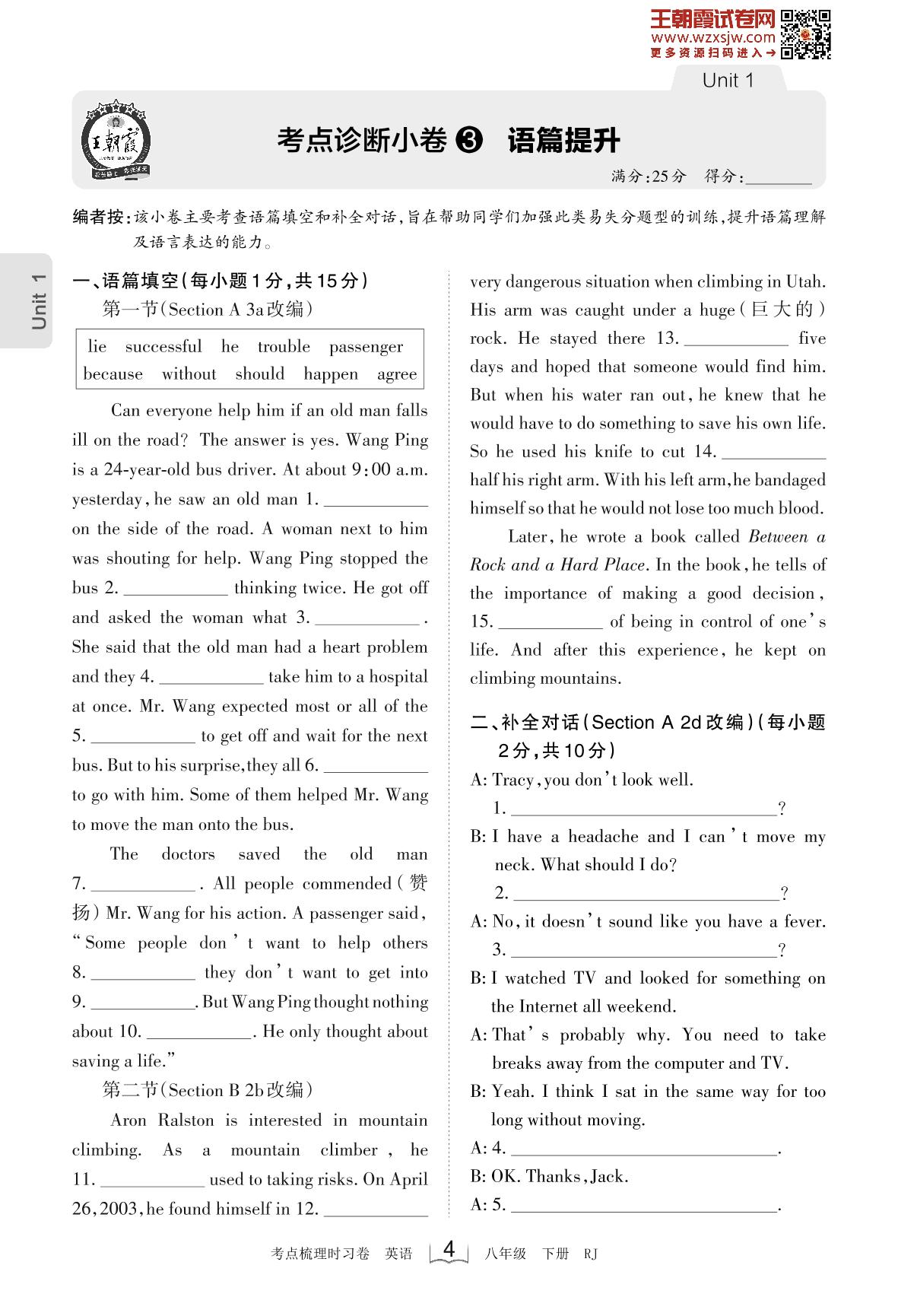 2023下册八年级英语人教版 Unit 1 考点诊断小卷3 语篇提升_R230220090450322
