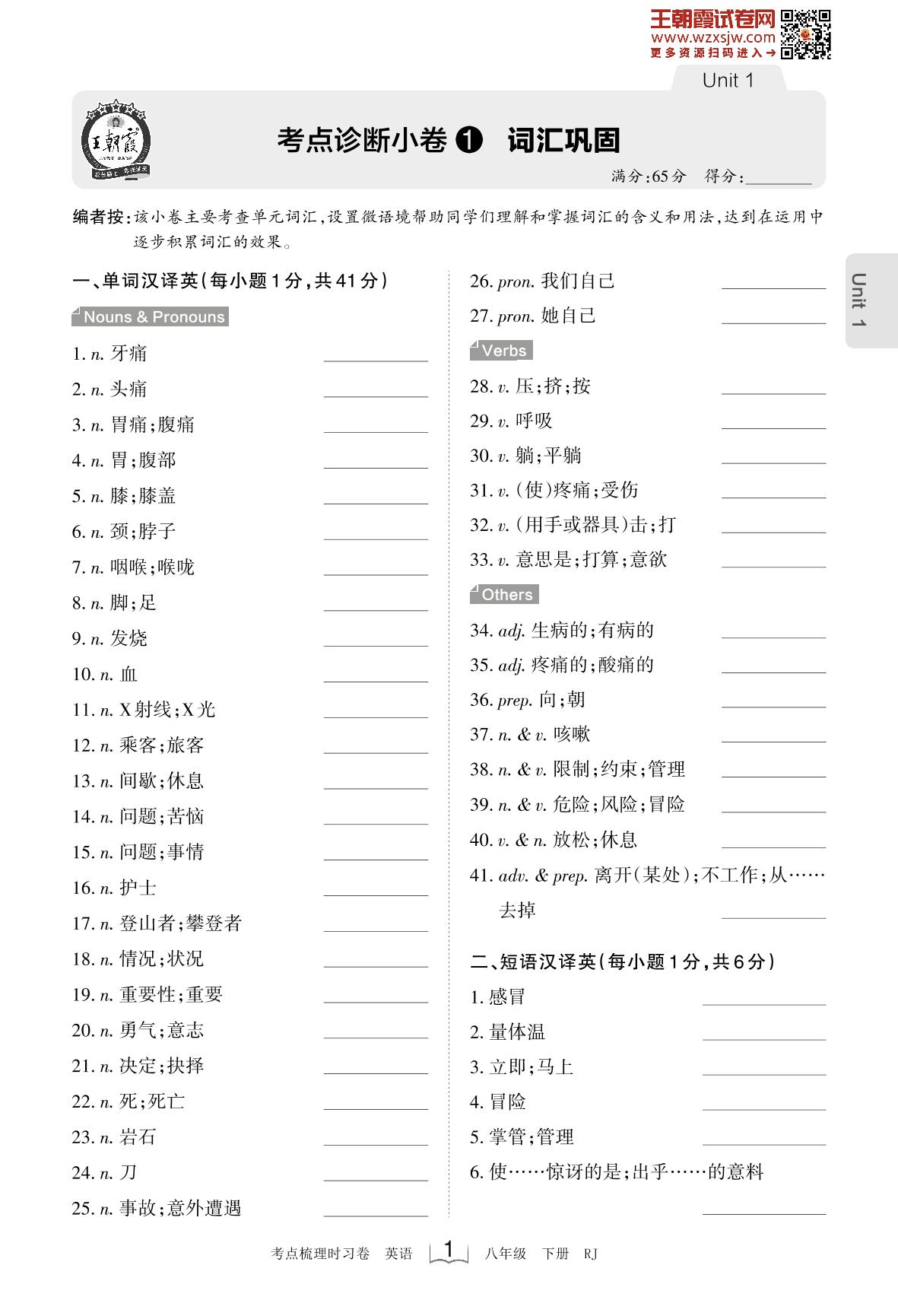 2023下册八年级英语人教版 Unit 1 考点诊断小卷1 词汇巩固_R230220090450922