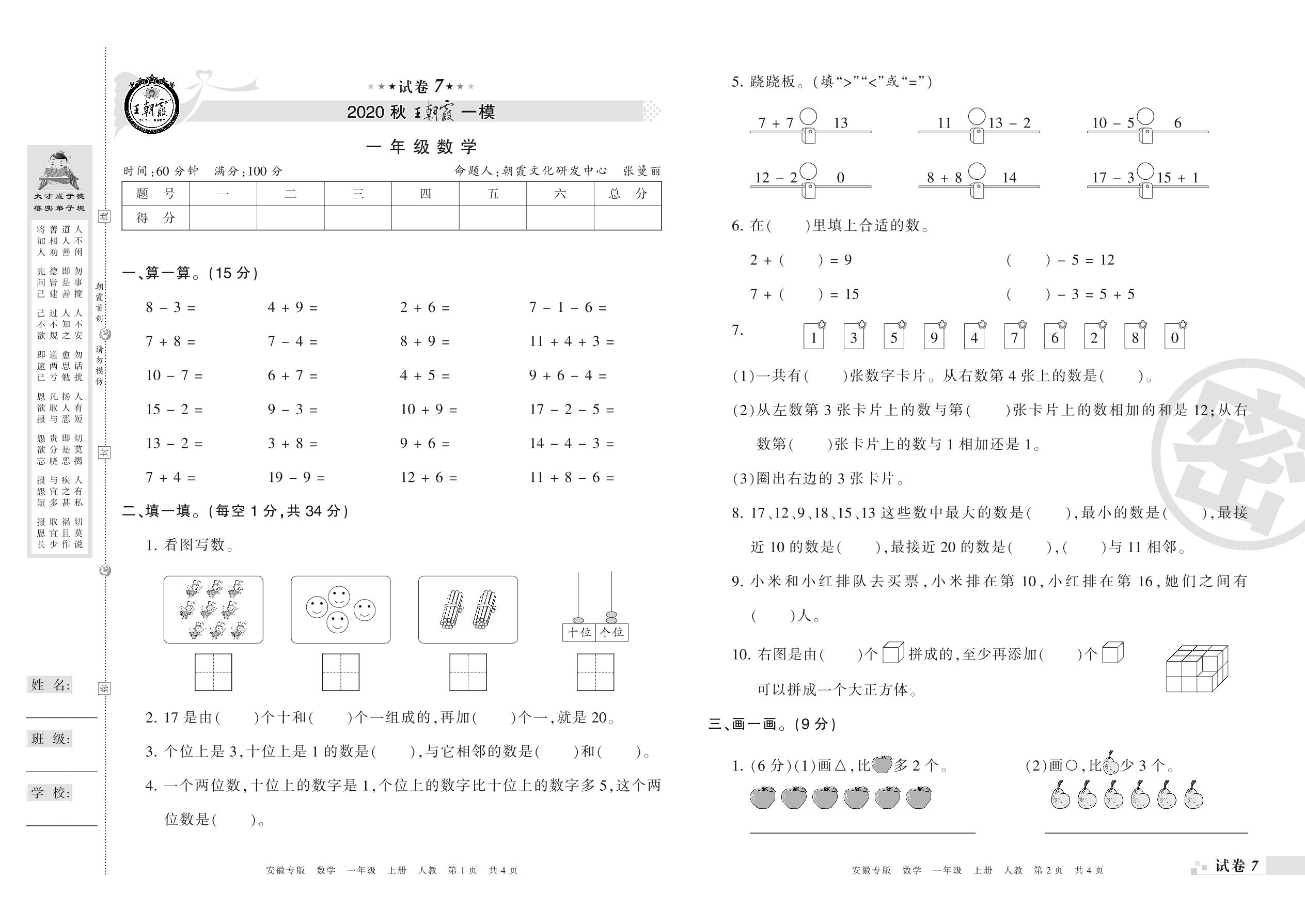王朝霞期末模拟卷一年级上册数学(人教版)_R210802212319【7】