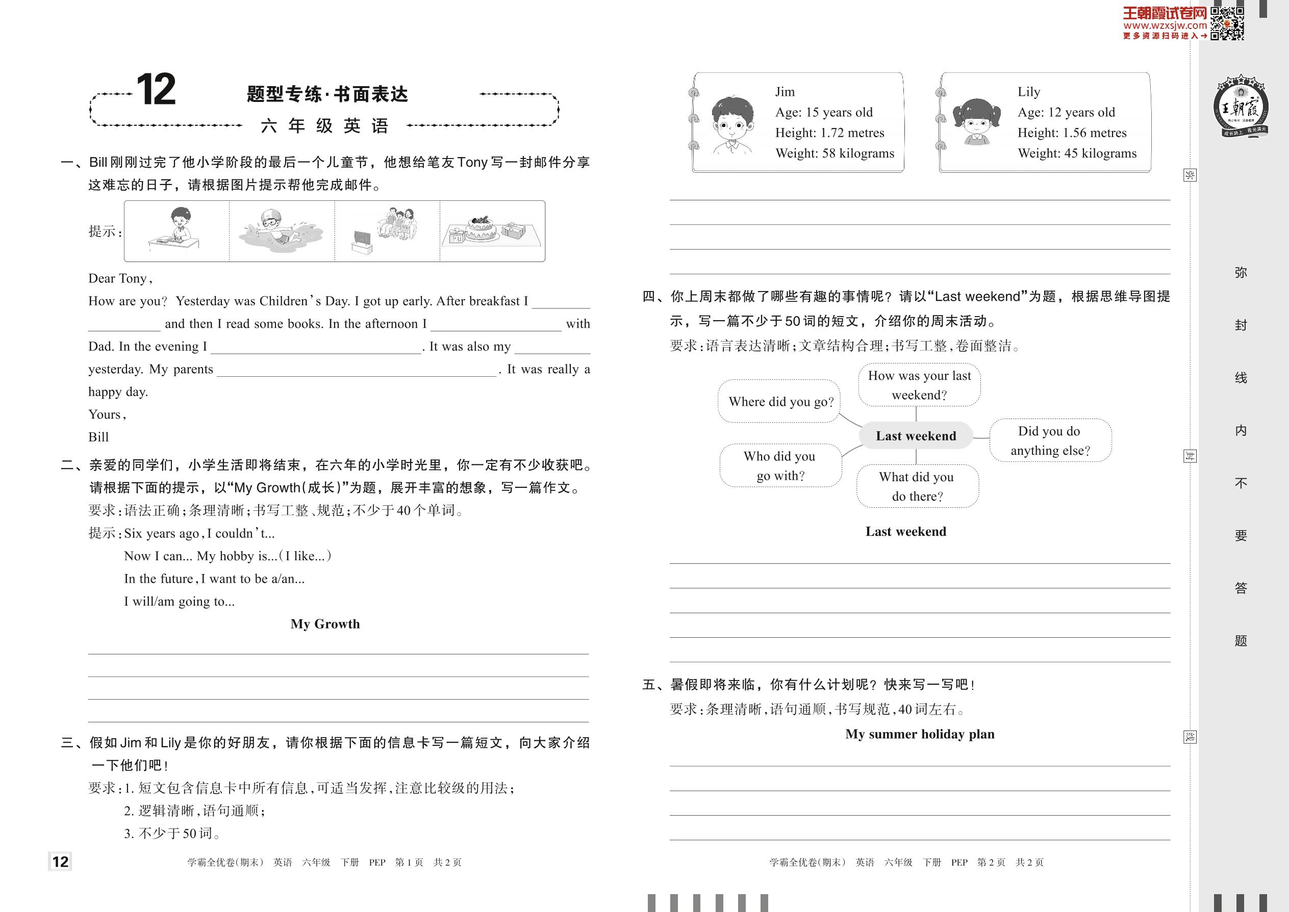 2023下册六年级英语人教PEP版 12 题型专练·书面表达