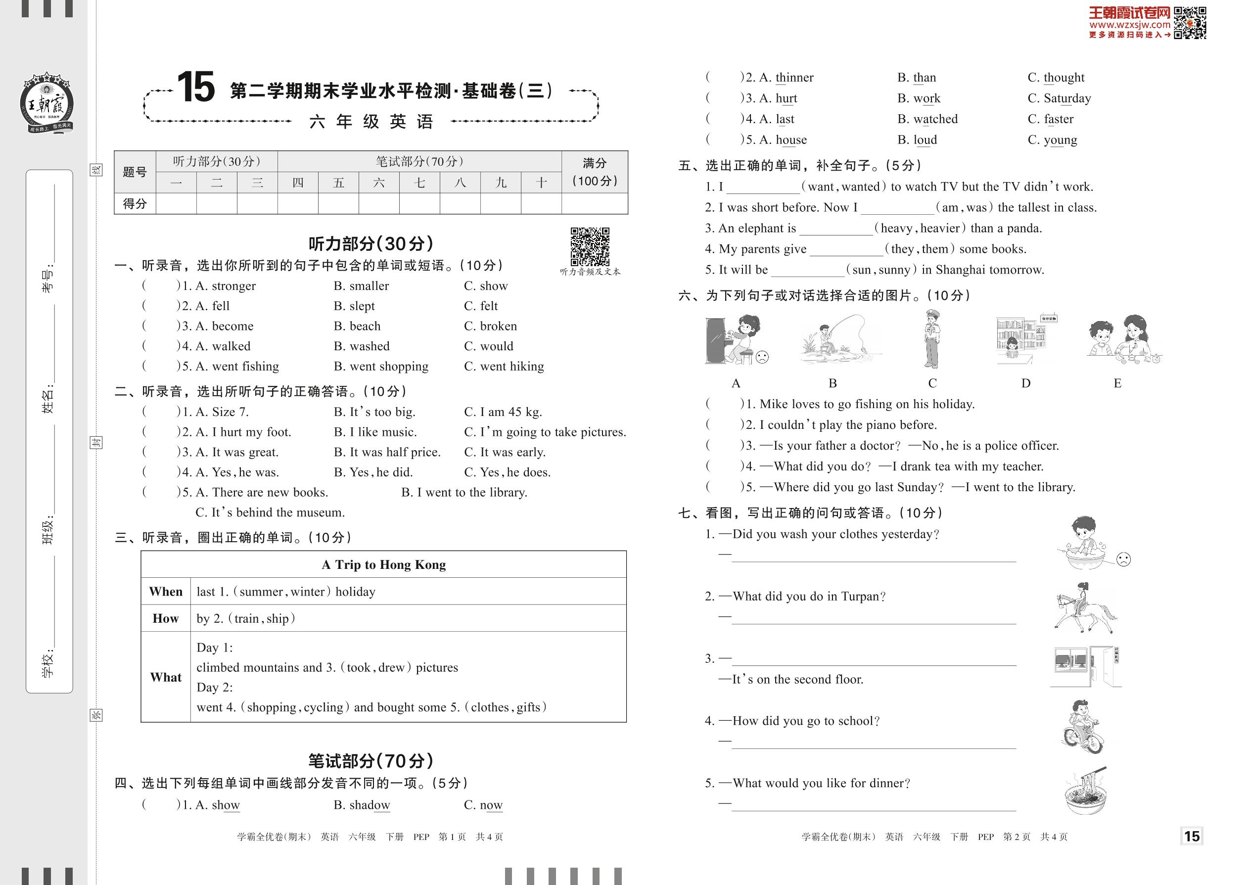 2023下册六年级英语人教PEP版 15 第二学期期末学业水平检测·基础卷(三)