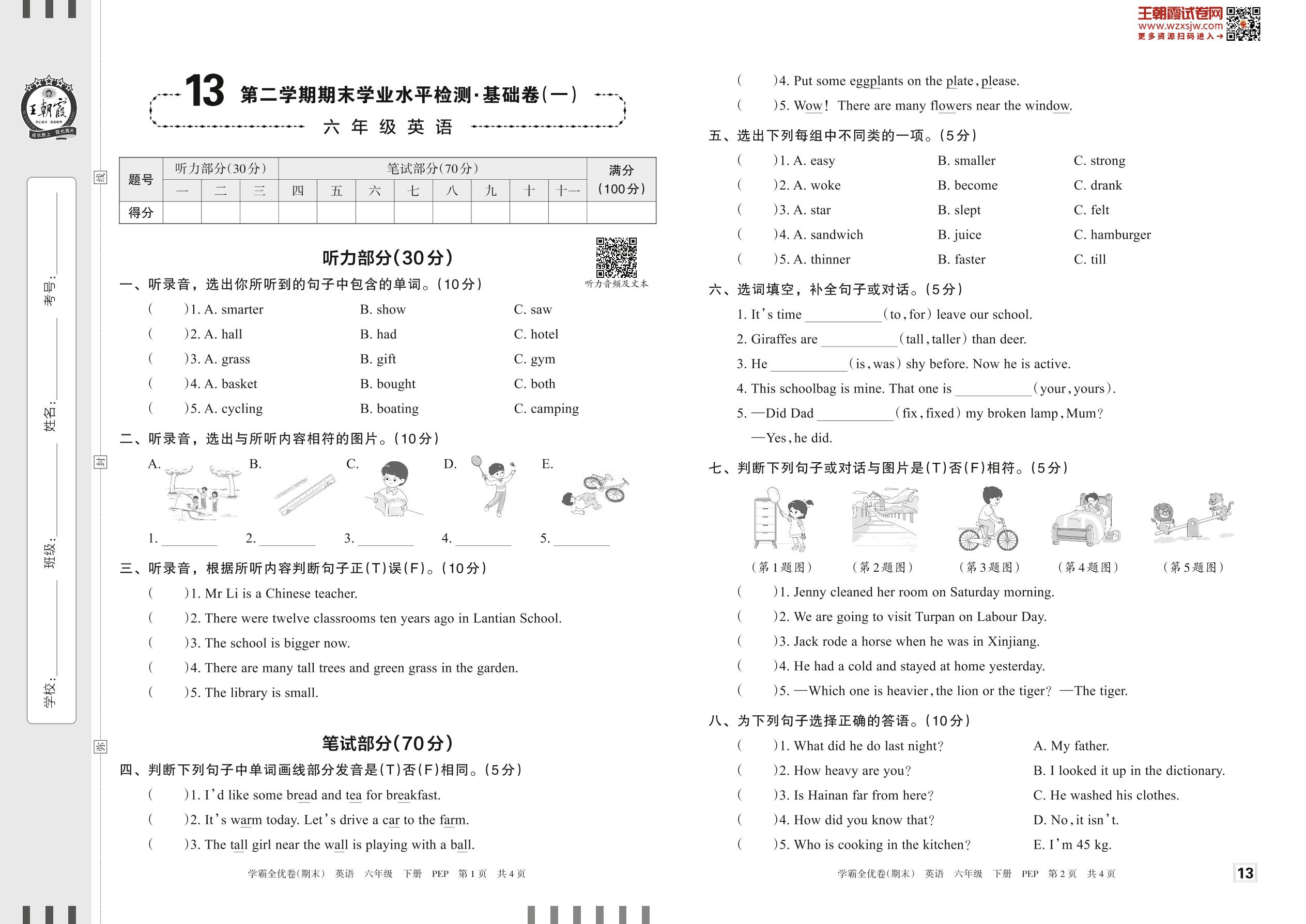 2023下册六年级英语人教PEP版 13 第二学期期末学业水平检测·基础卷(一)
