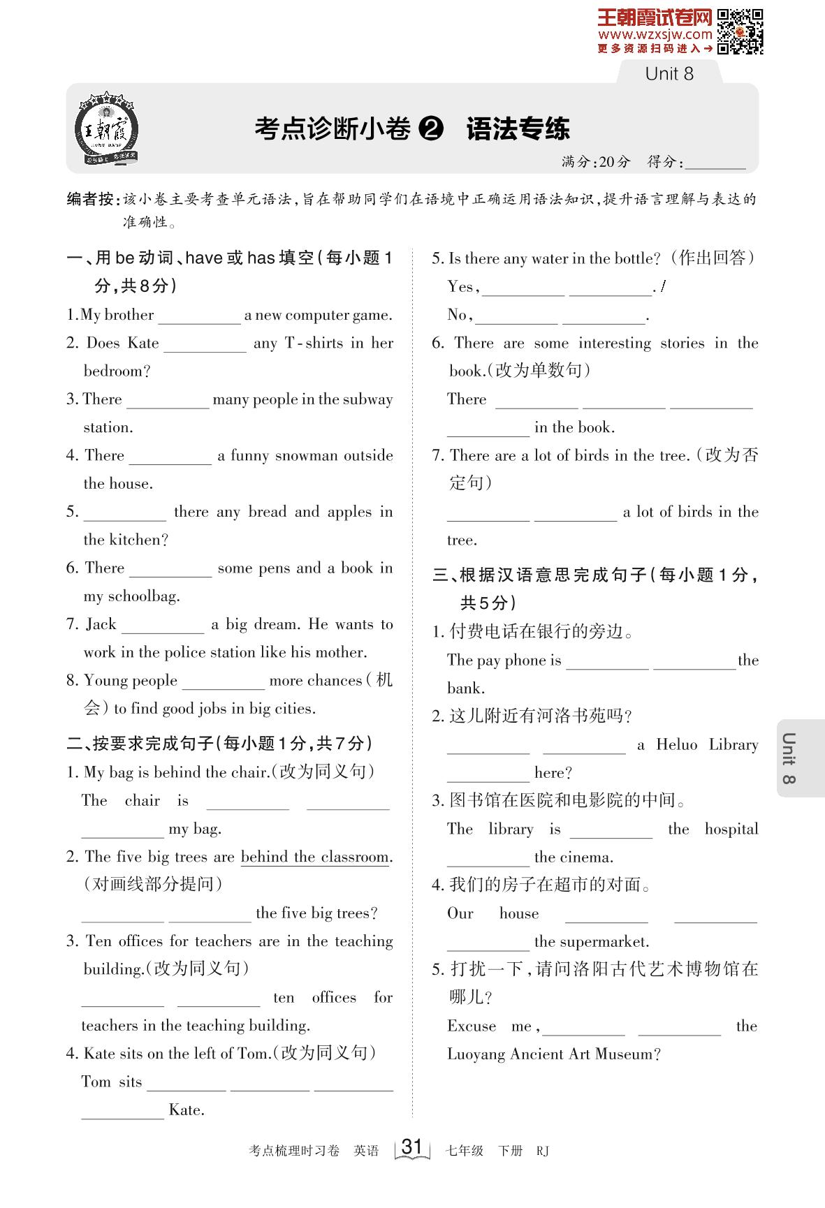 2023下册七年级英语人教版 Unit 8 考点诊断小卷2 语法专练_R230220091932964