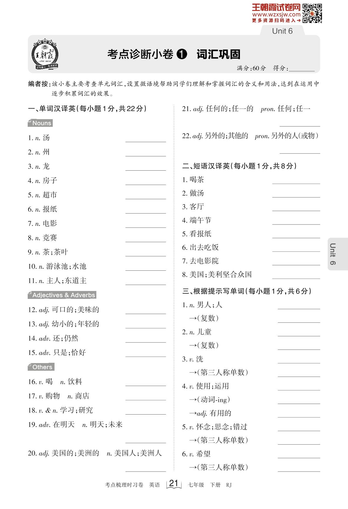 2023下册七年级英语人教版 Unit 6 考点诊断小卷1 词汇巩固_R230220091933587