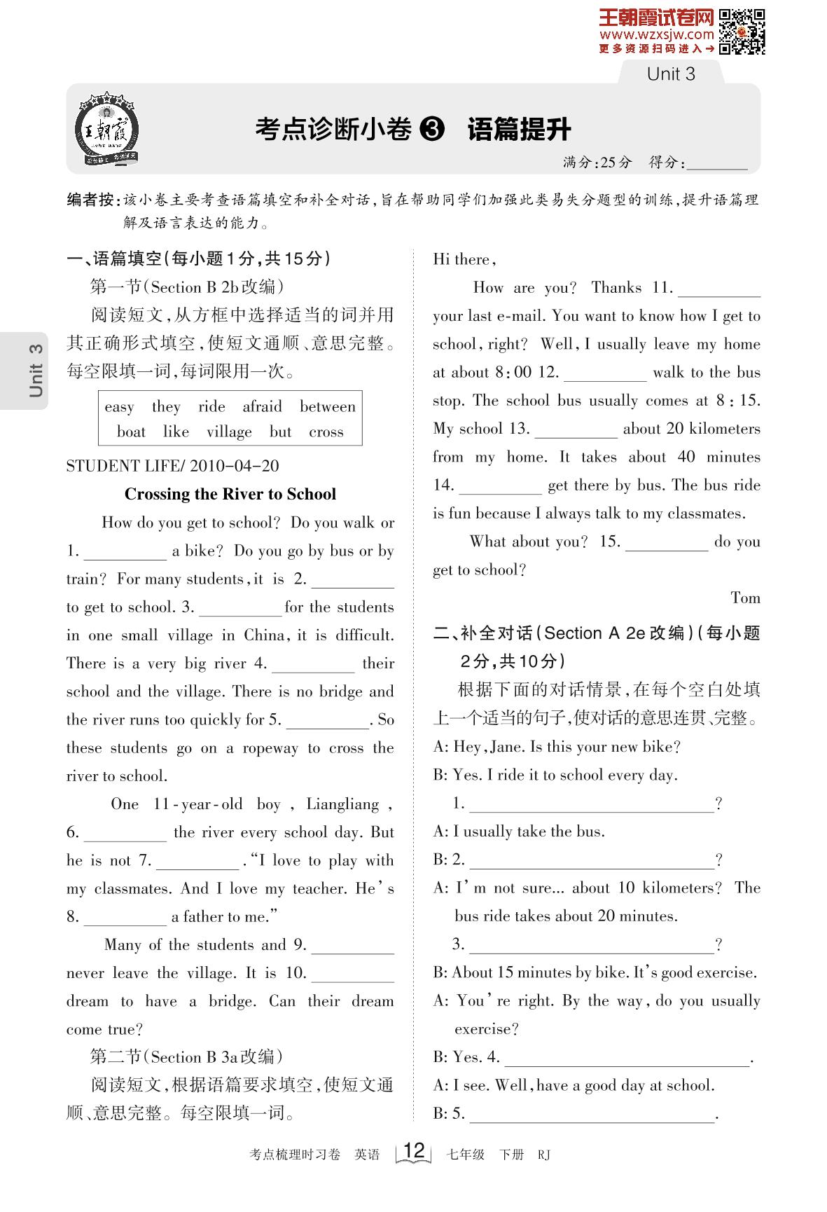 2023下册七年级英语人教版 Unit 3 考点诊断小卷3 语篇提升_R230220091934767