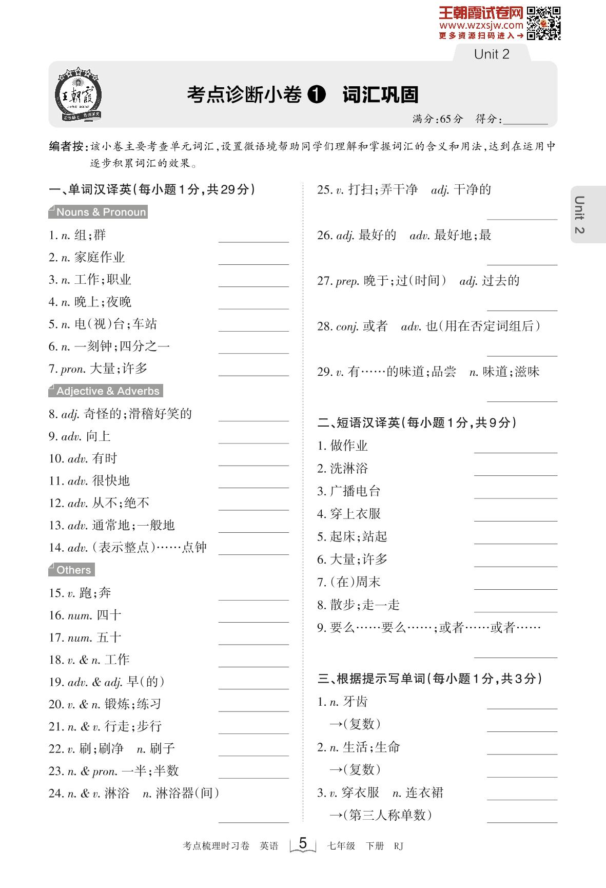 2023下册七年级英语人教版 Unit 2 考点诊断小卷1 词汇巩固_R230220091934375