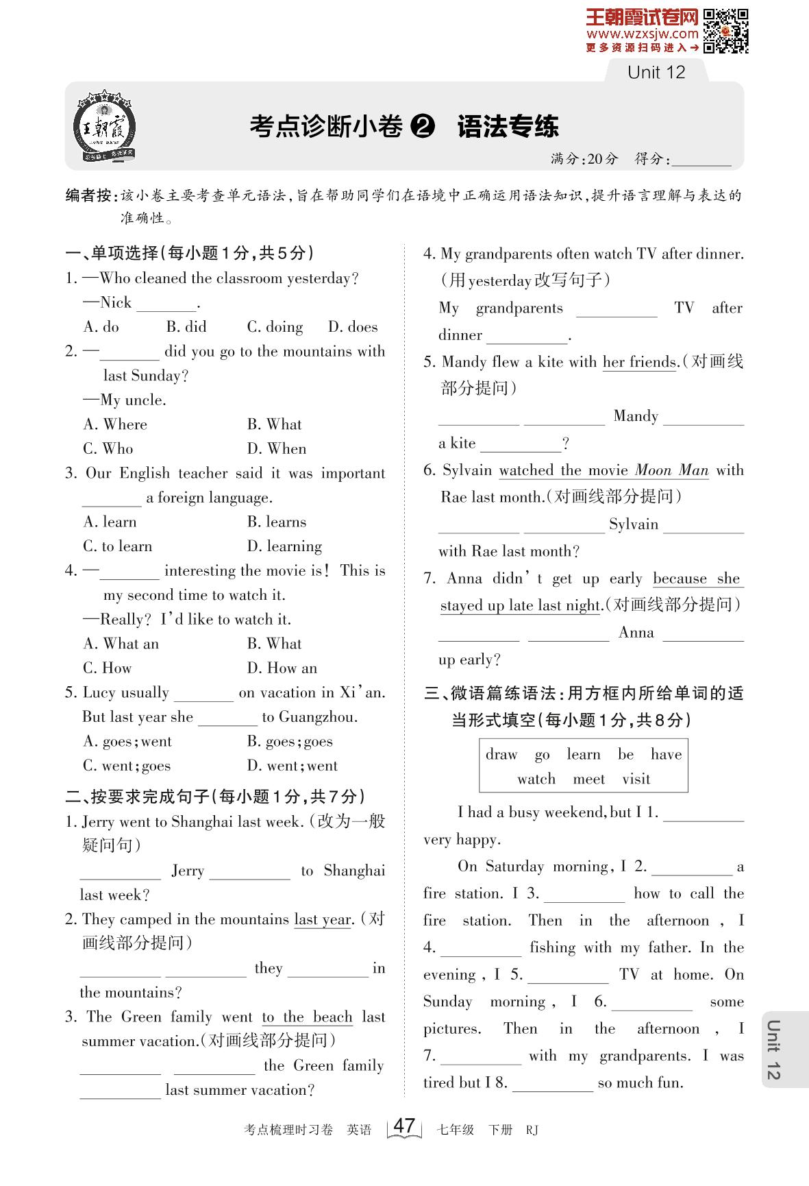 2023下册七年级英语人教版 Unit 12 考点诊断小卷2 语法专练_R230220091935088