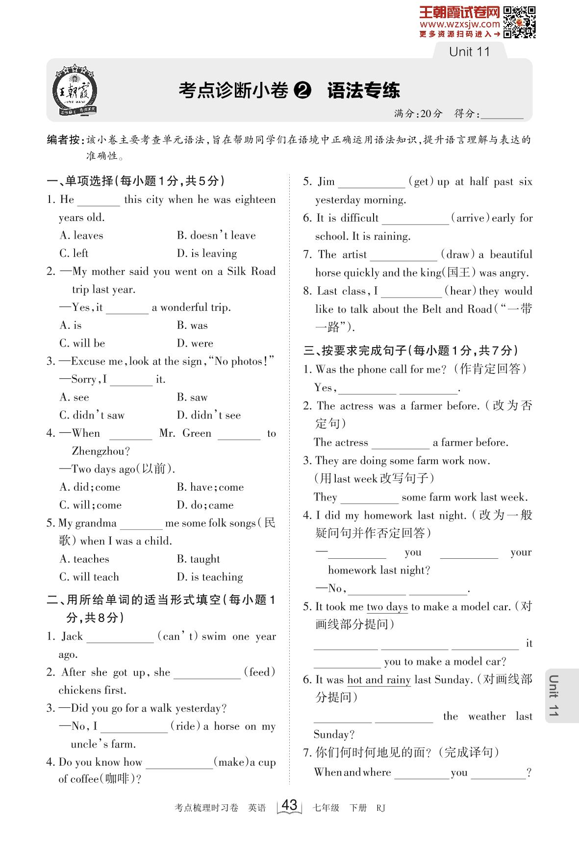 2023下册七年级英语人教版 Unit 11 考点诊断小卷2 语法专练_R230220091935864