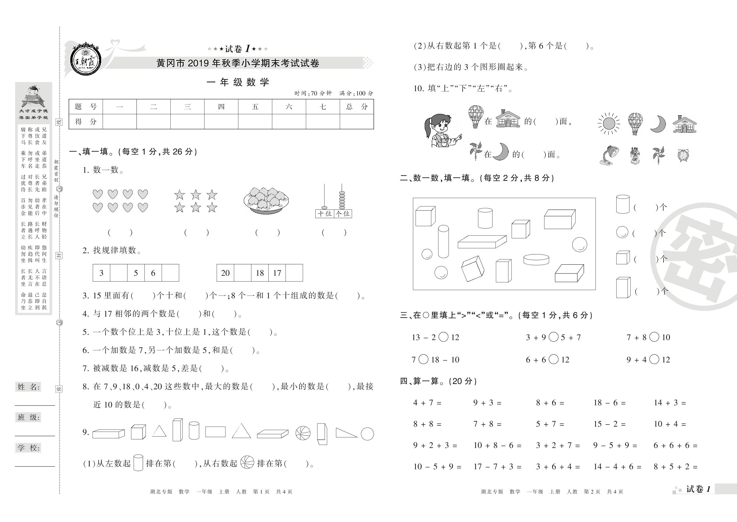 2019-2020学年第一学期黄冈市一年级数学试卷(人教版)【1】