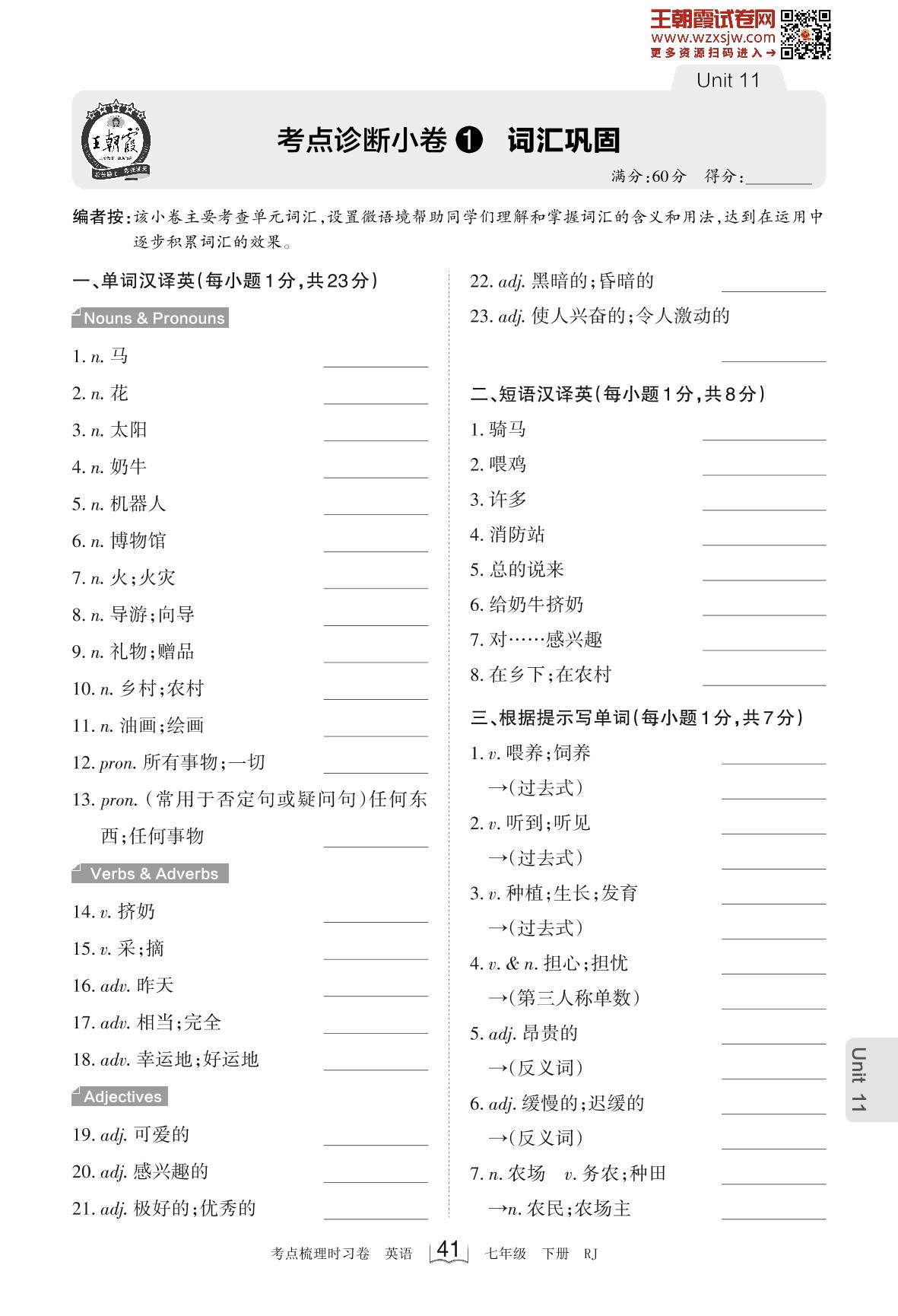 2023下册七年级英语人教版 Unit 11 考点诊断小卷1 词汇巩固_R230220091935943
